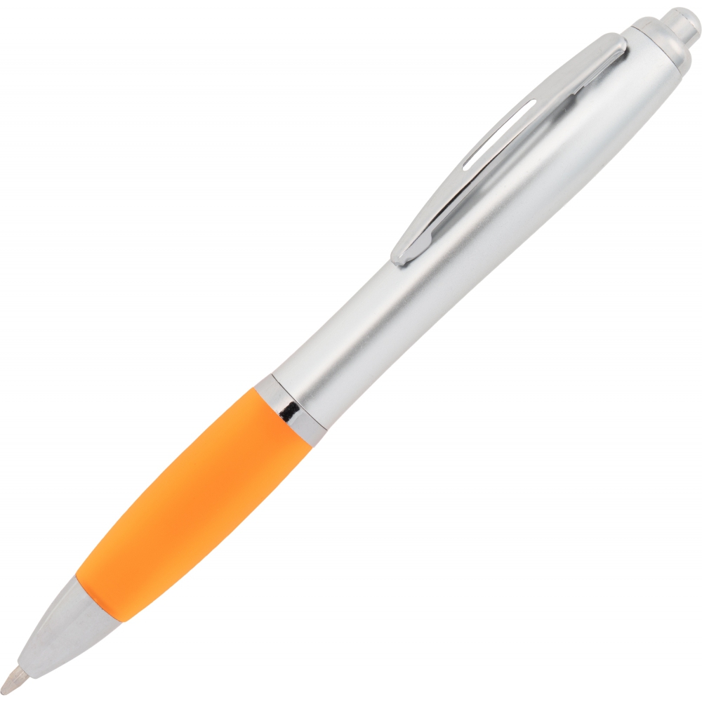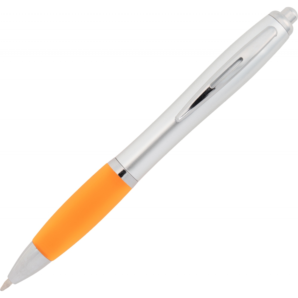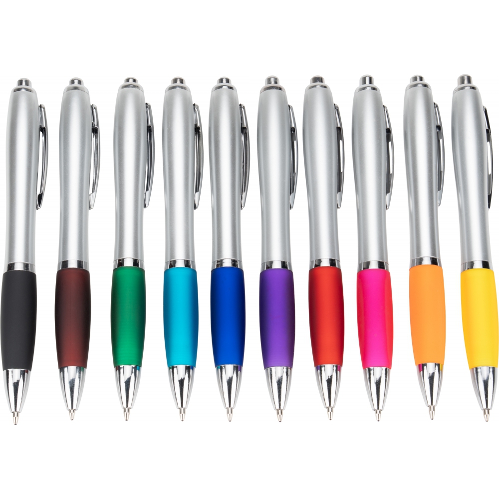 Plastikowy długopis z satynowym połyskiem, metalowym klipsem, gumowanym korpusem i dużym niebieskim wkładem.