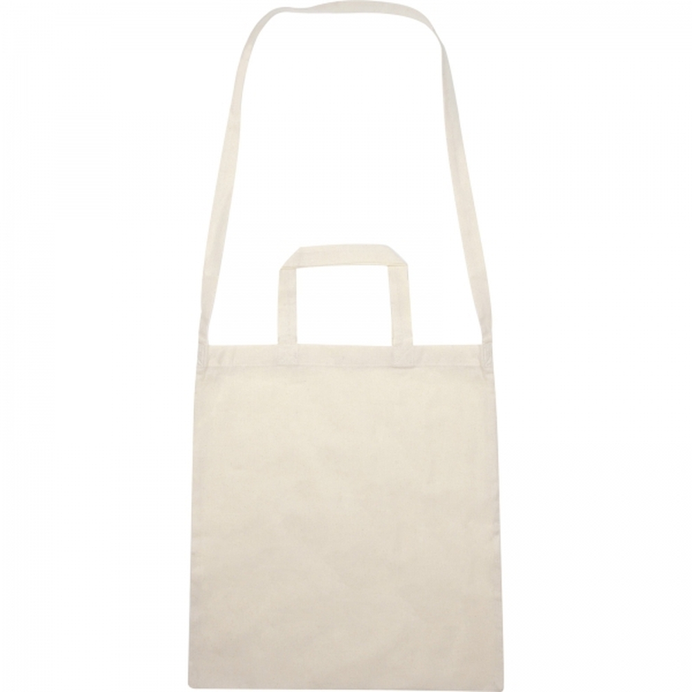 Torba bawełniana w naturalnym kolorze, o gramaturze 140g/m² z dwoma krótkimi uszami i jednym długim, do noszenia na ramieniu. Certyfikat ECO Tex standard 100.