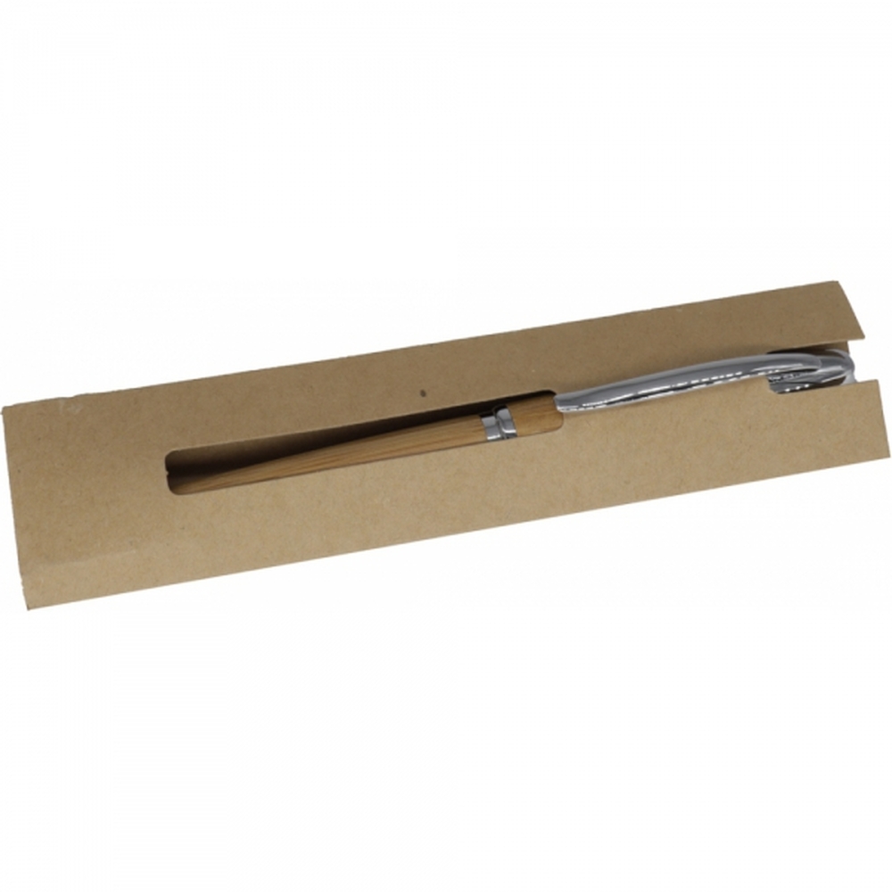 Długopis wykonany z bambusa i metalu, posiada piszący na niebiesko wkład o dużej pojemności.