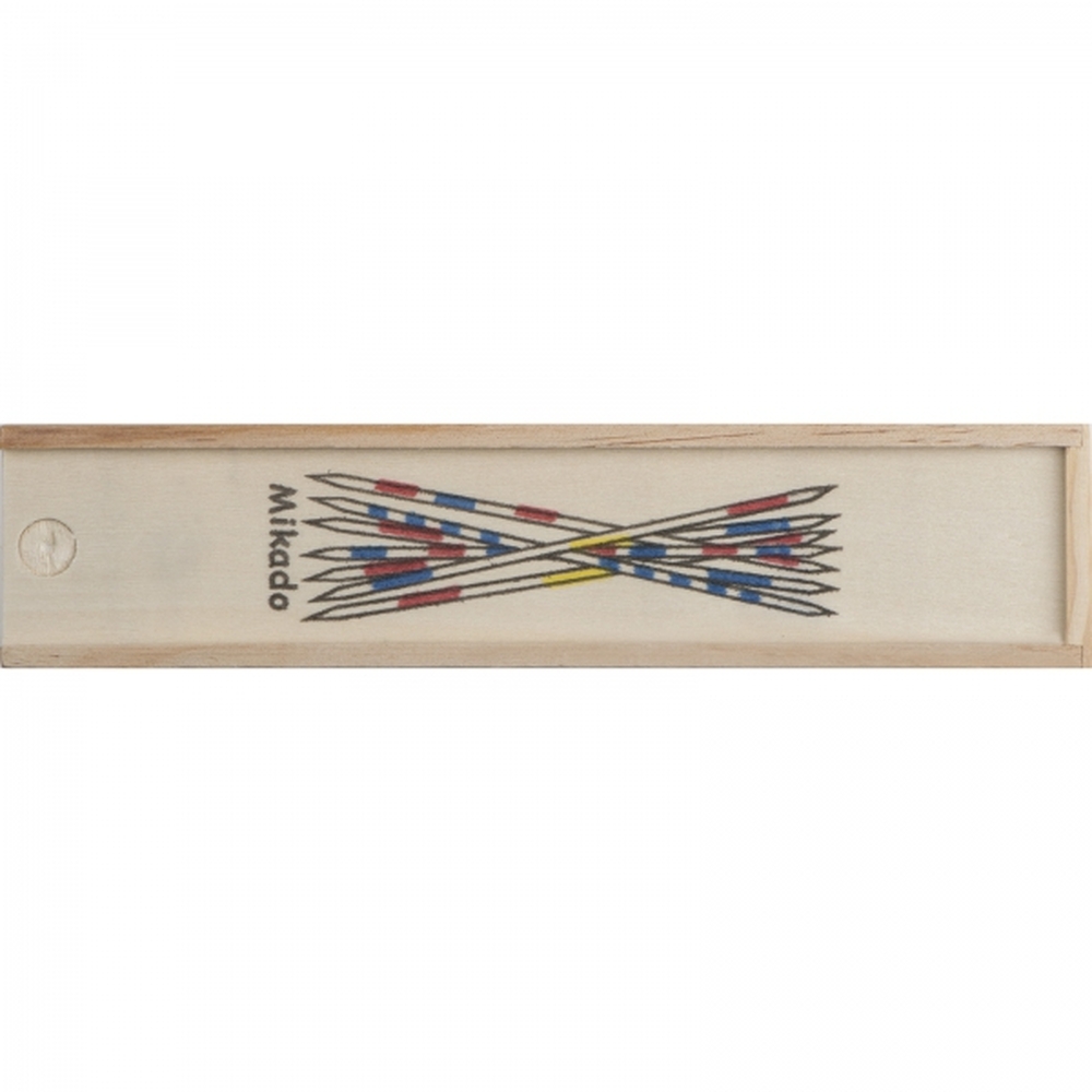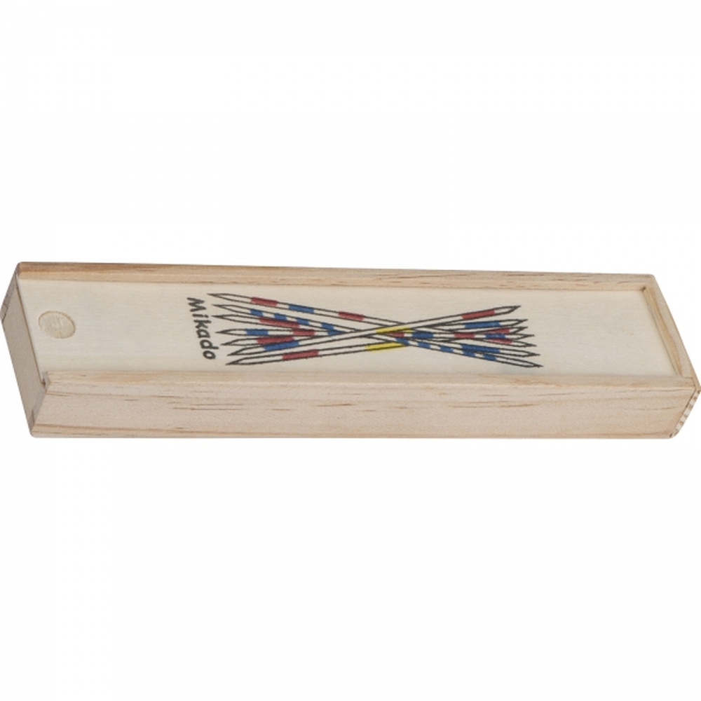Zręcznościowa gra Mikado składająca się z drewnianych patyczków zapakowanych w drewniane pudełko.
