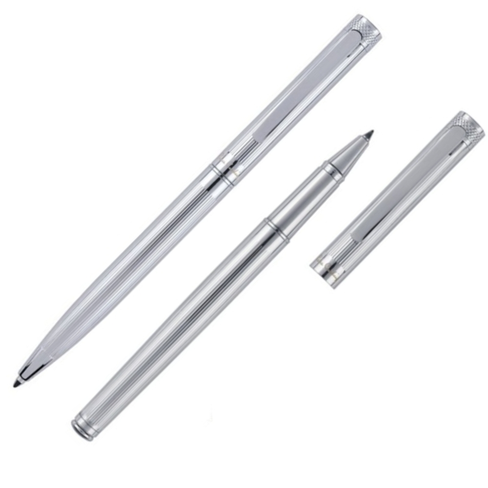 Najwyższej jakości zestaw piśmienniczy składający się z długopisu (1 mm) i pióra kulkowego (0,6 mm) pochodzących z kolekcji RENEE. Przybory piśmienne wykonane z metalu z chromowanymi elementami, obydwa piszące na niebiesko. Zestaw zapakowany w eleganckie pudełko prezentowe z certyfikatem autentyczności Pierre Cardin.
