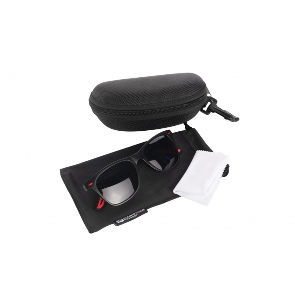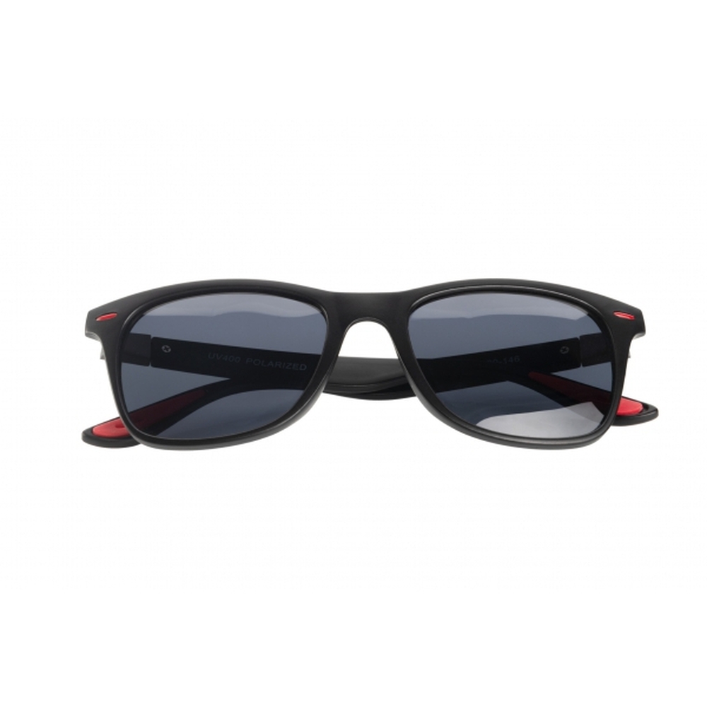 Polaryzacyjne okulary przeciwsłoneczne. Oprawa okularów w kolorze czarnym z czerwonymi detalami i metalowymi zawiasami, na których umieszczono logo Schwarzwolf. Posiadają czarne soczewki z ochroną UV400. W zestawie czarny woreczek z mikrofibry i twarde czarne etui z zamkiem błyskawicznym. W zestawie biała ściereczka czyszcząca z mikrofibry.