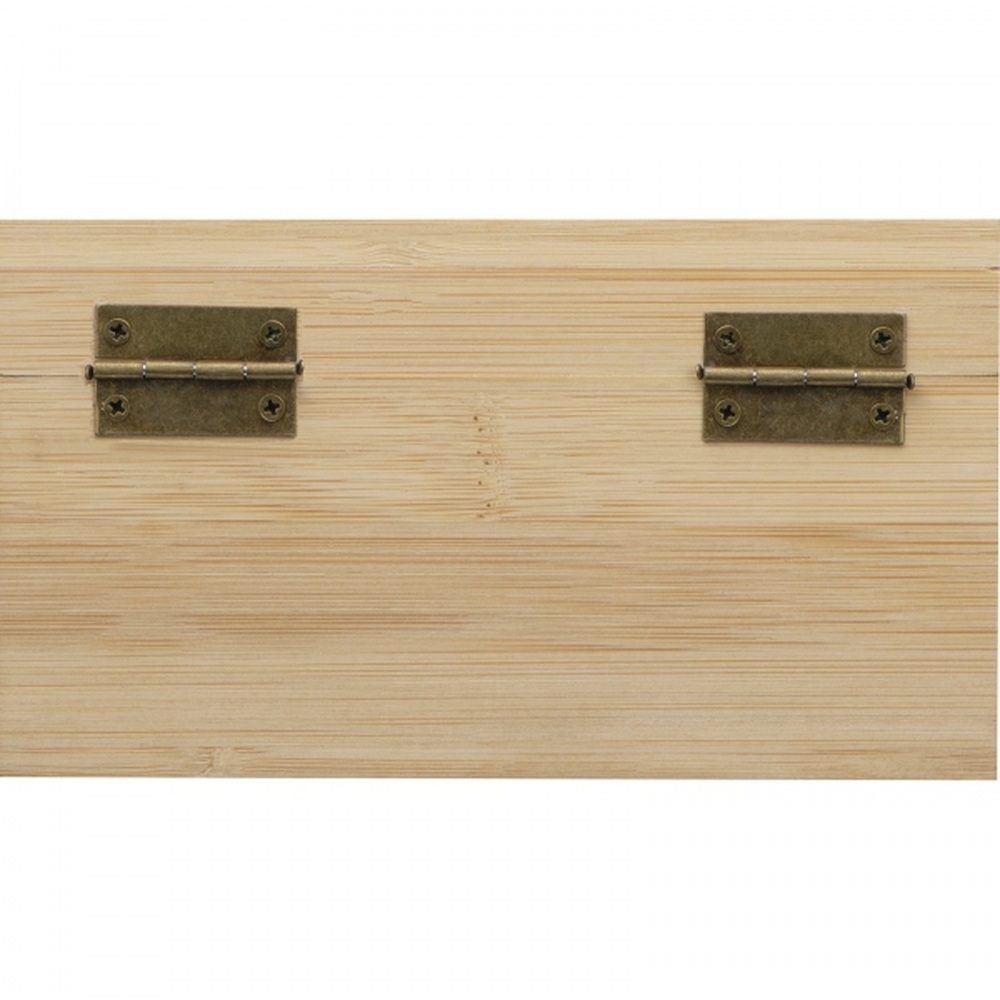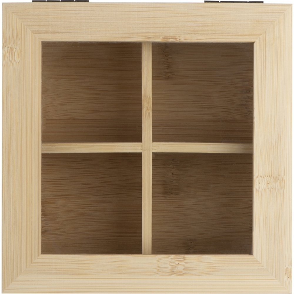 Bambusowe pudełko na herbatę, posiada 4 przegródki i przeszkloną pokrywkę.
