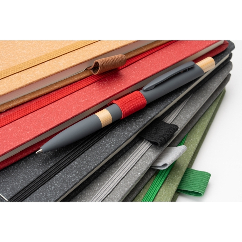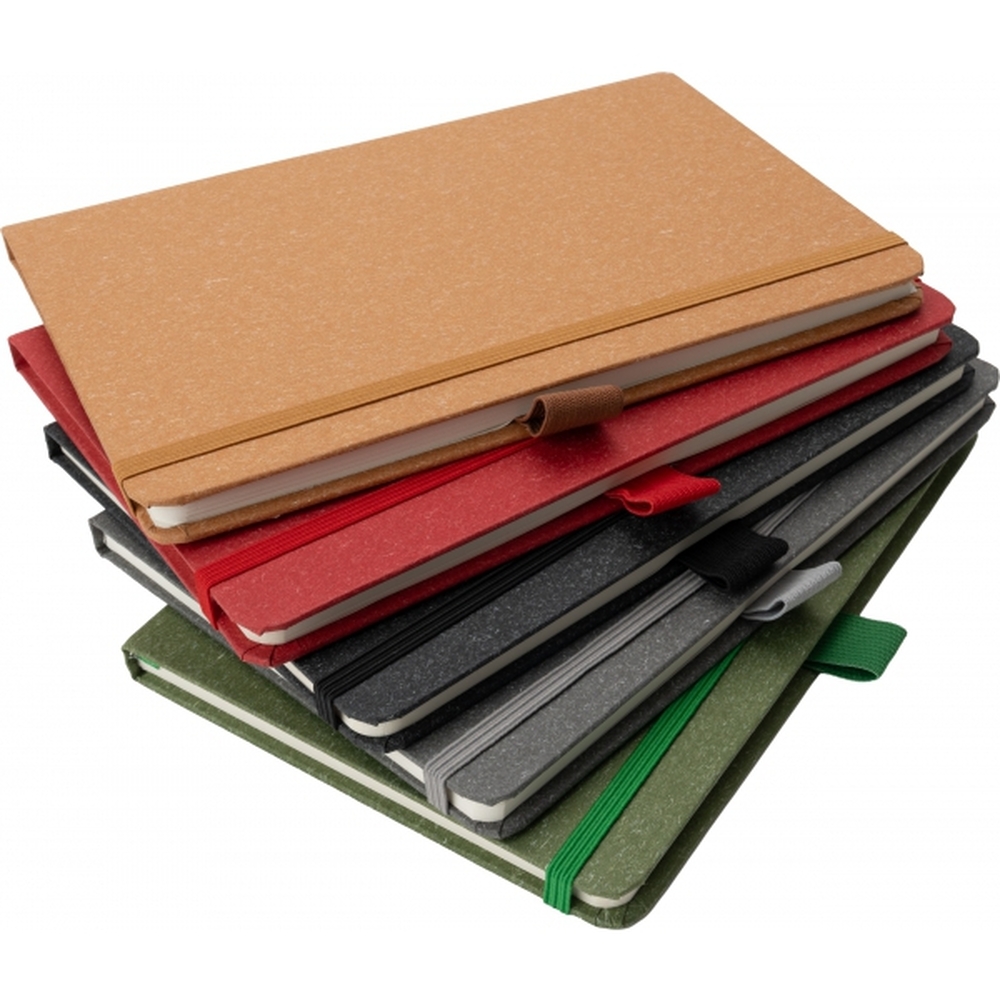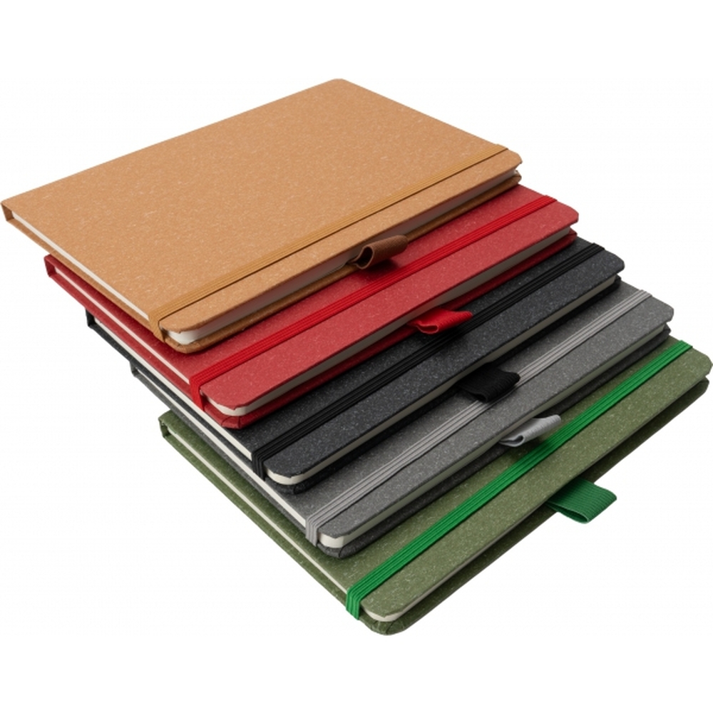 Notes o formacie A5 z zakładką i 160 stronami w kropki, zamykany na gumkę. Zarówno tekturowa okładka, jak i kartki są wykonane z papieru pochodzącego z recyklingu.