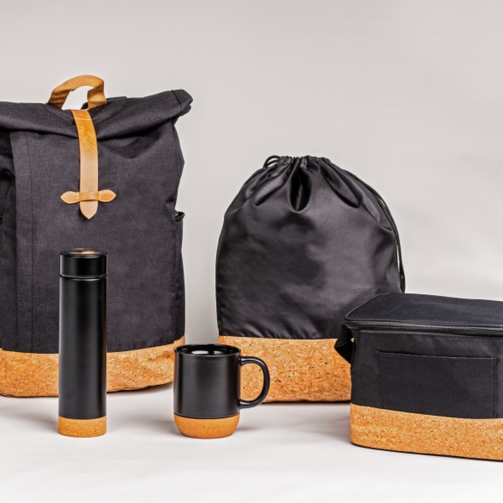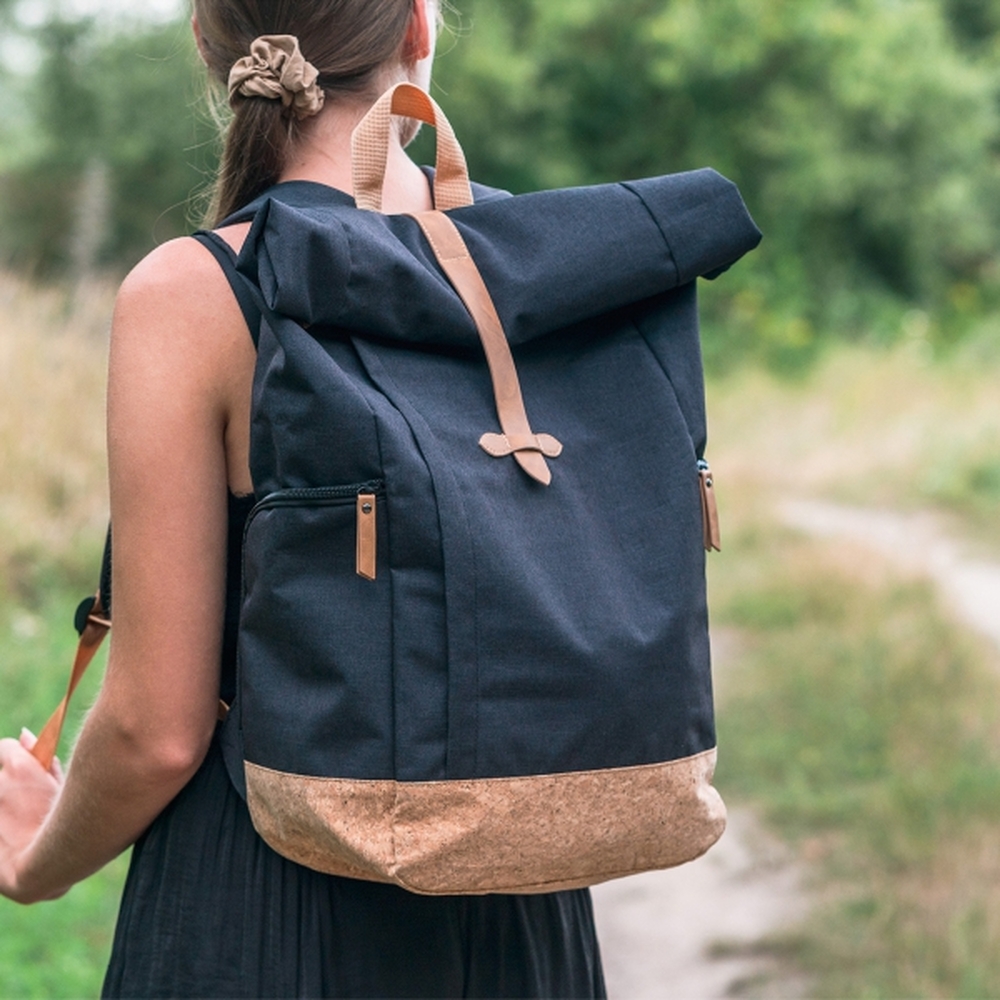 Plecak wykonany z poliestru 300D i RPET 210D. Komora główna zamyka się poprzez zrolowanie i zapięcie. Plecak posiada 2 kieszonki boczne zamykane na zamek, regulowane szelki i uchwyt do przenoszenia oraz dno wykończone korkiem.