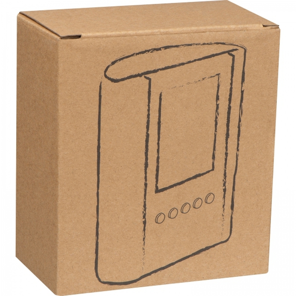 Stojak biurkowy na długopisy z bambusowym frontem i wbudowanym zegarem elektronicznym, posiadającym wiele funkcji, takich jak: zegar, minutnik, budzik, kalendarz, termometr oraz przypominanie o urodzinach.