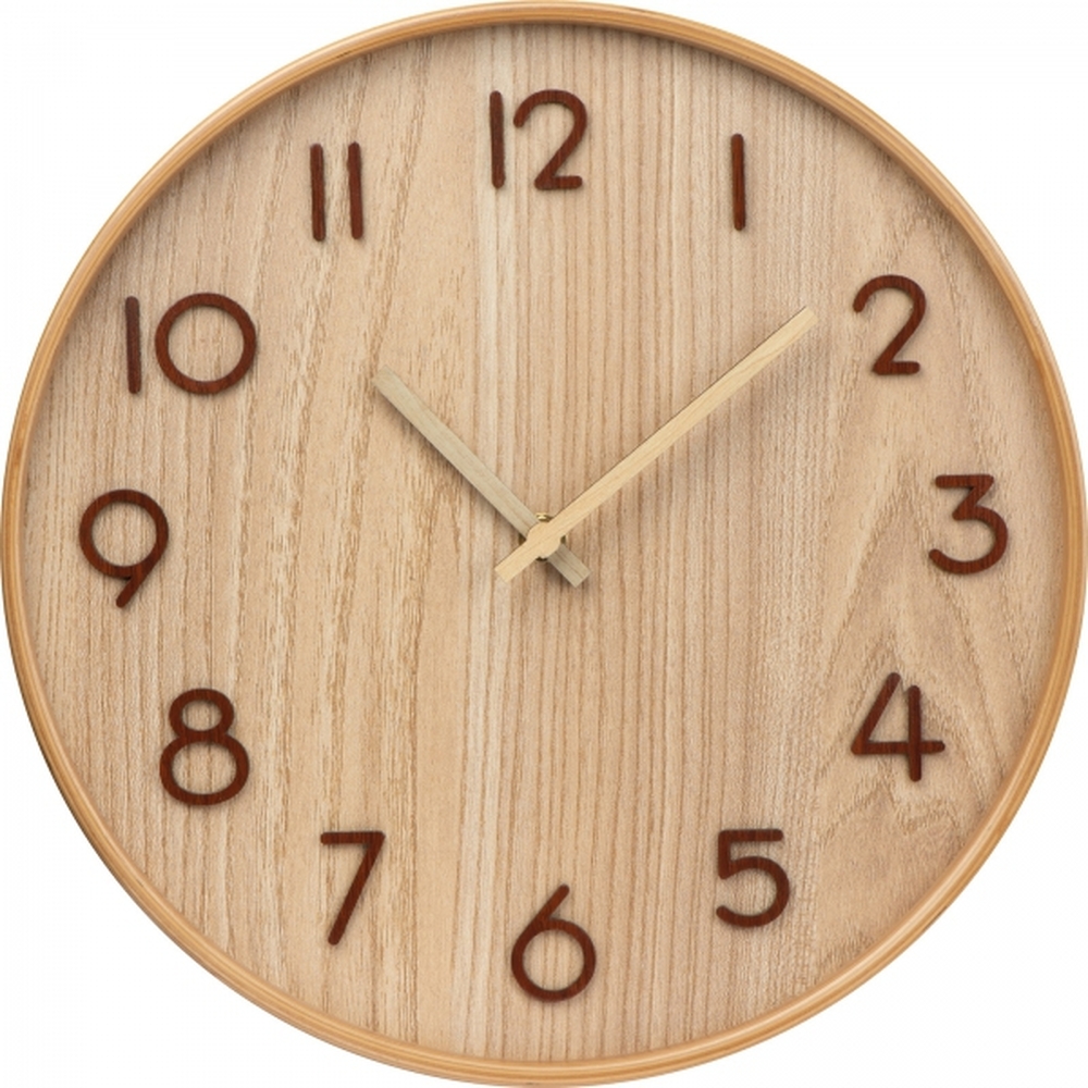 Drewniany zegar ścienny ze wskazówkami godzinowymi i minutowymi oraz wypukłymi cyframi wykonanymi z drewna. Zasilany bateriami AA.