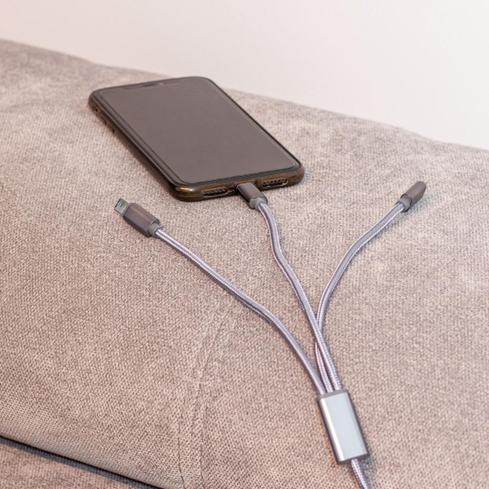 Kabel USB z funkcją ładowania fast charging, o długości 120 cm, posiada 3 różne końcówki: micro USB, USB typu C oraz lightning, dzięki czemu będziesz w stanie podłączyć każdy typ urządzenia. Moc wyjściowa 3.8 , 2.1A/5V.