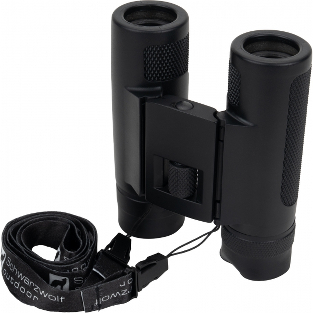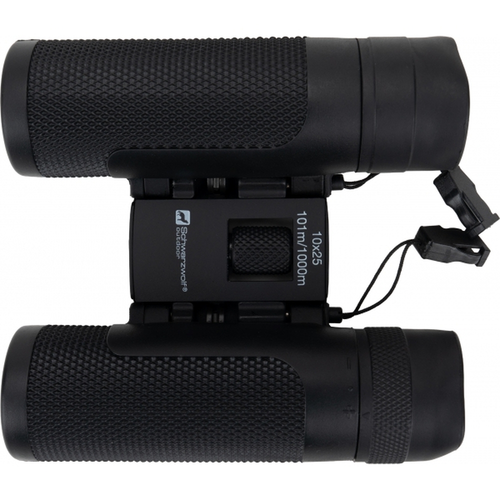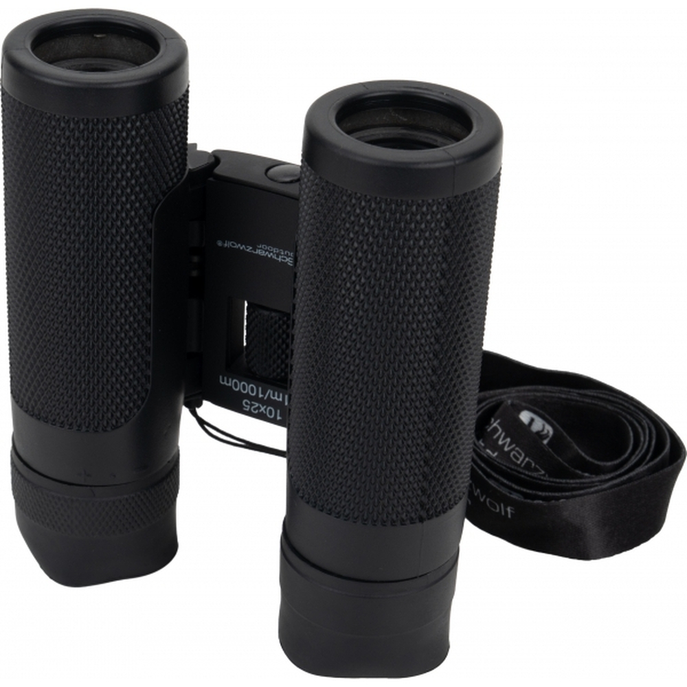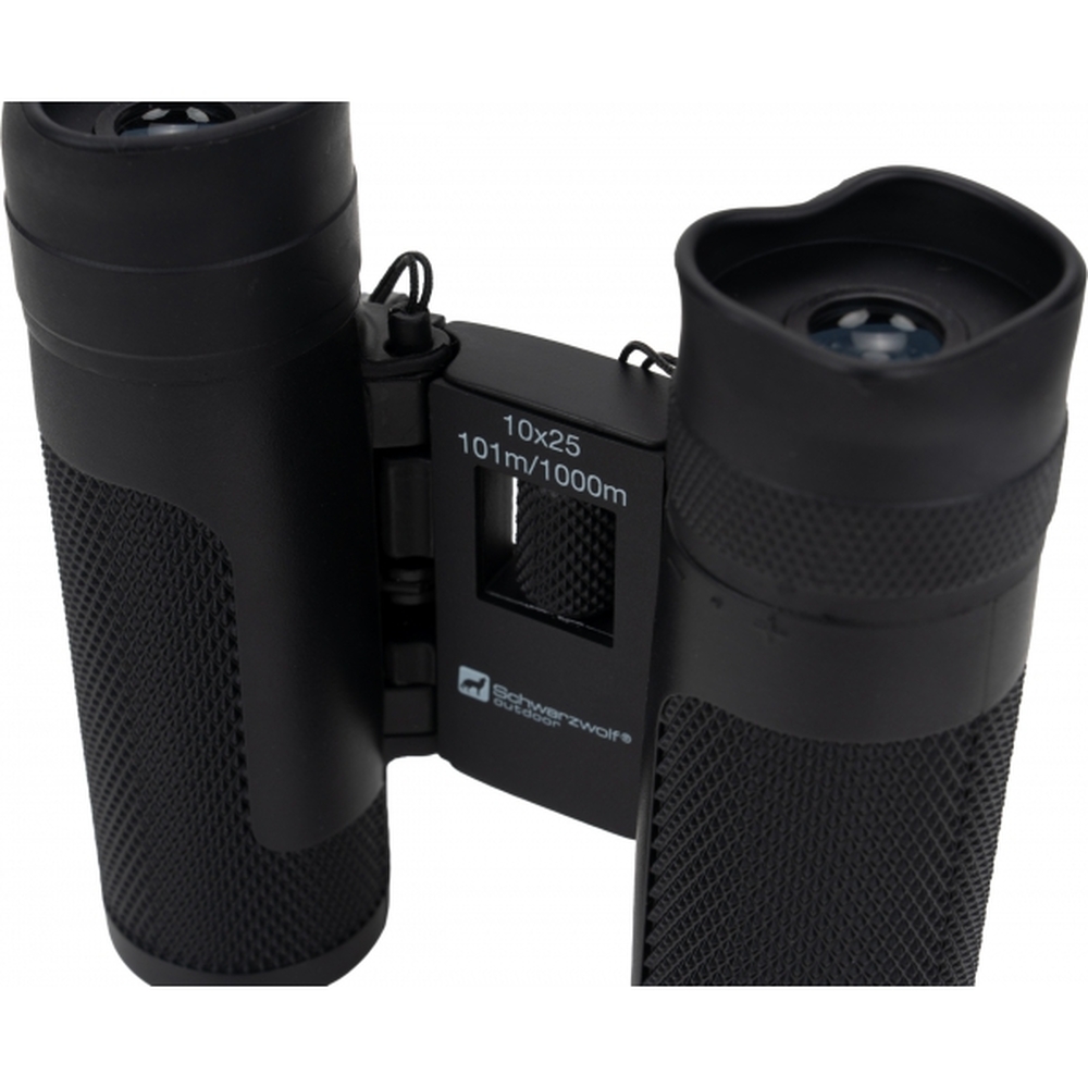 Lornetka Schwarzwolf o powiększeniu 10x i średnicy obiektywu 25mm, pole widzenia na 1000 m: 101 m, kąt widzenia 5,8°, średnia źrenica wyjściowa to 11 mm, minimalna odległość ostrzenia to 3 m. Lornetka zapakowana w neoprenowy futerał z paskiem na szyję.