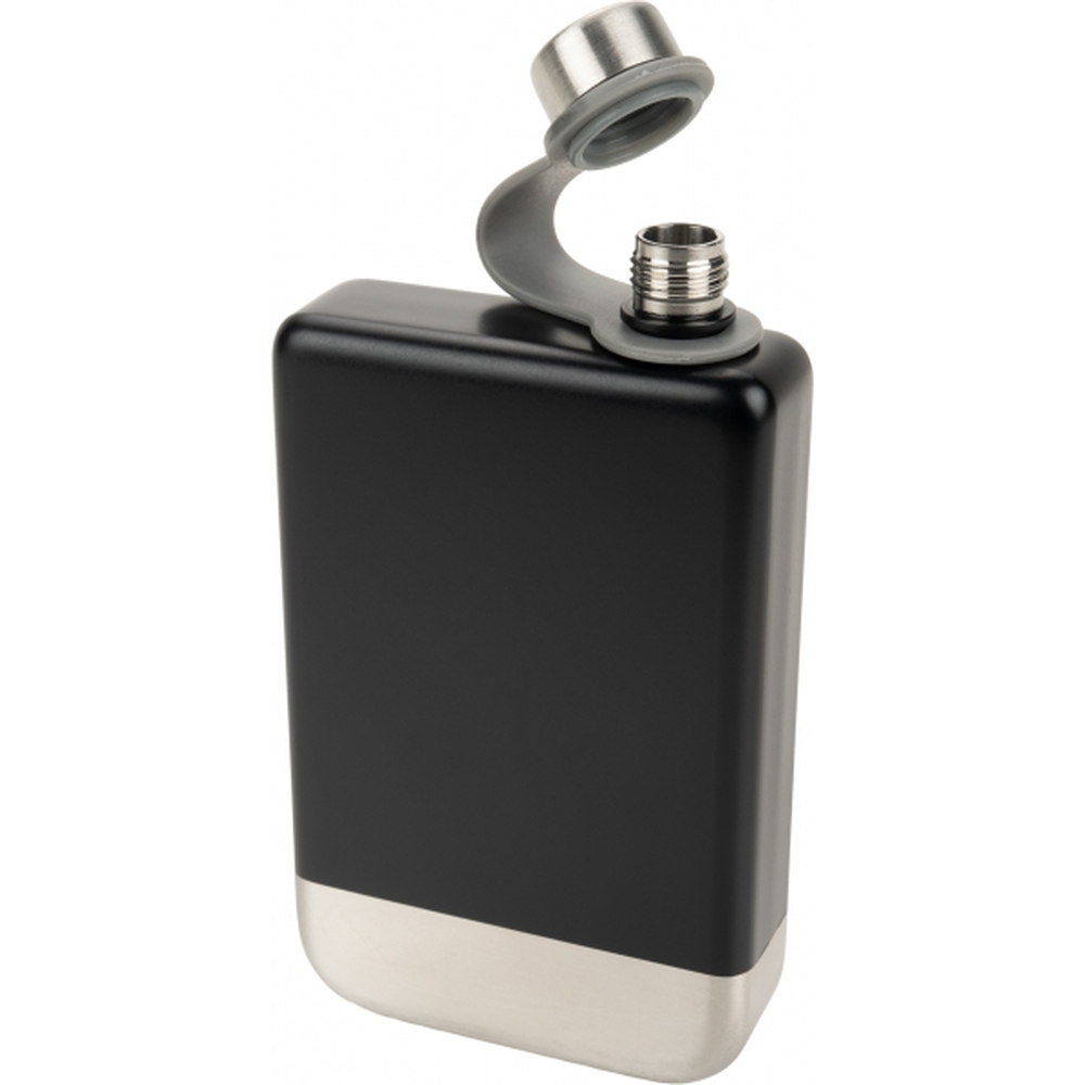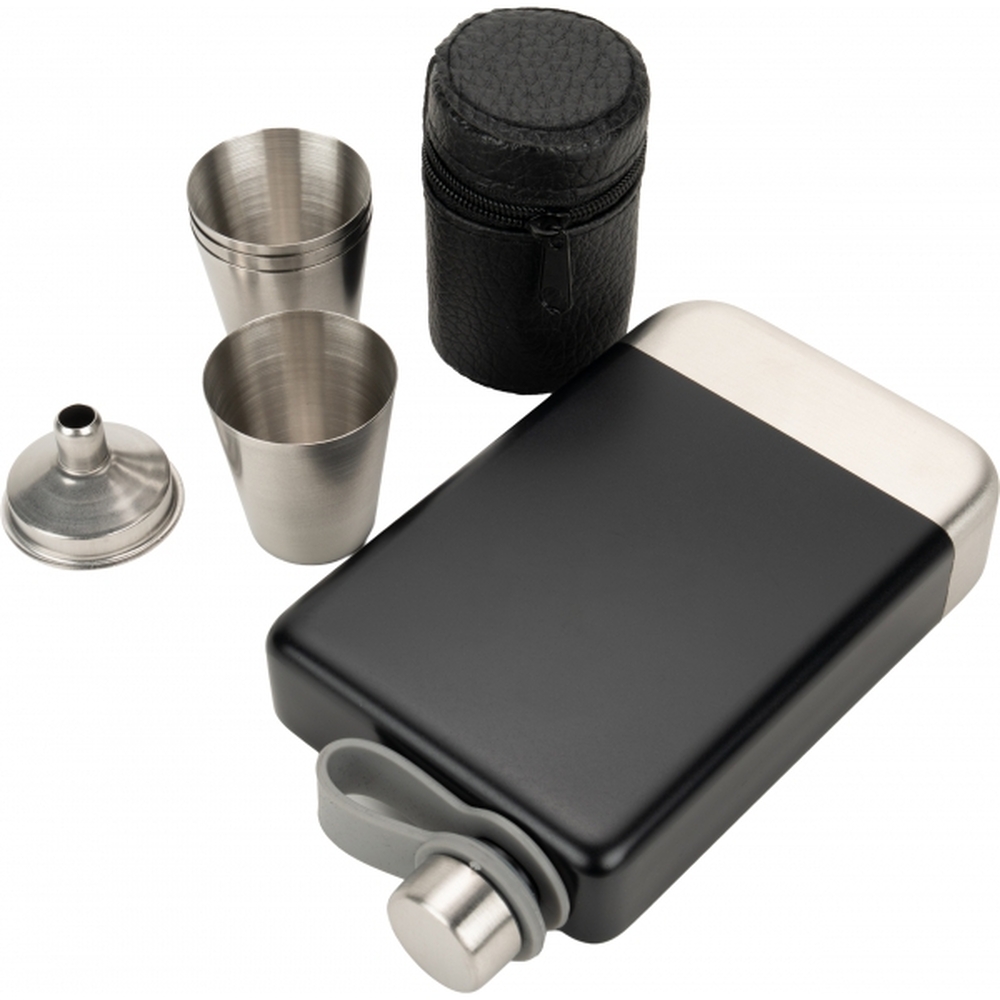 Zestaw Schwarzwolf hip flask set. Zawiera: piersiówkę w czarno-srebrnej kombinacji ze stali nierdzewnej, kieliszki 30 ml w czarnym woreczku i lejek. Na spodzie ścianki umieszczono logo Schwarzwolf. Rozmiar opakowania:18 x 18 x 4,5 cm