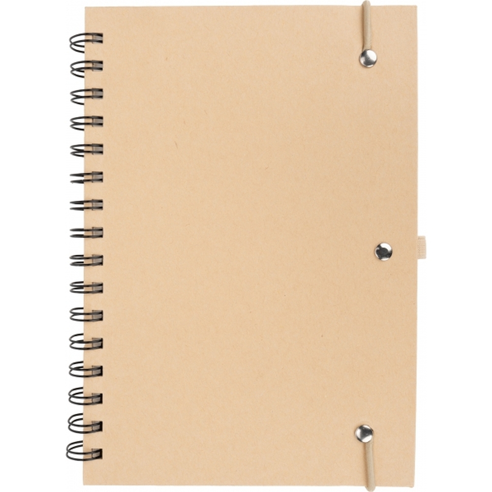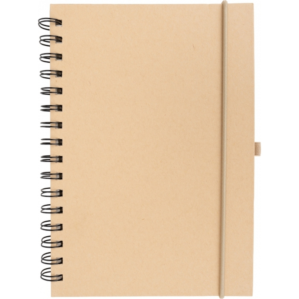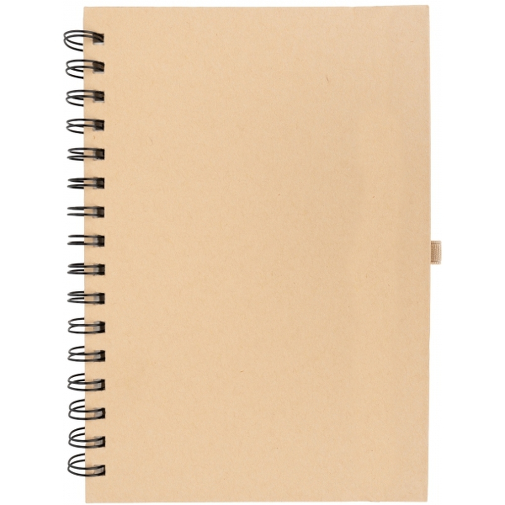 Notes o formacie A5 z kartkami w linie, wykonanymi z papieru pochodzącego z recyklingu. Posiada gumkę do zamykania i pętelkę na długopis.