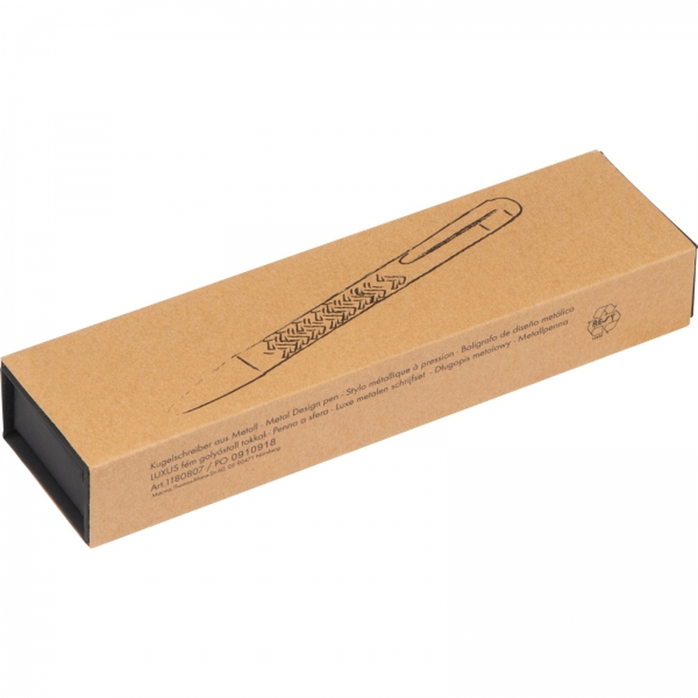 Oryginalny długopis wykonany z wysokiej jakości metalu. Zachwyca swą unikalną formą oraz jakością wykonania. Logotyp proponujemy umieścić na klipsie.