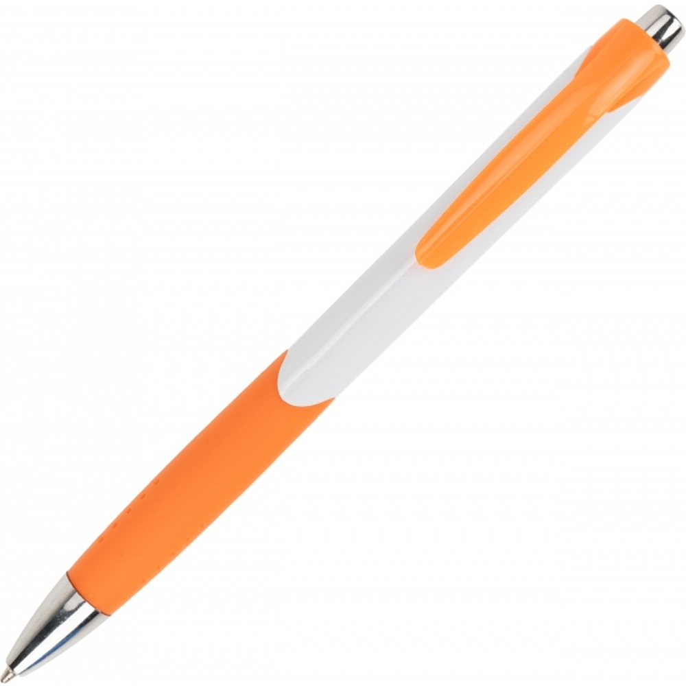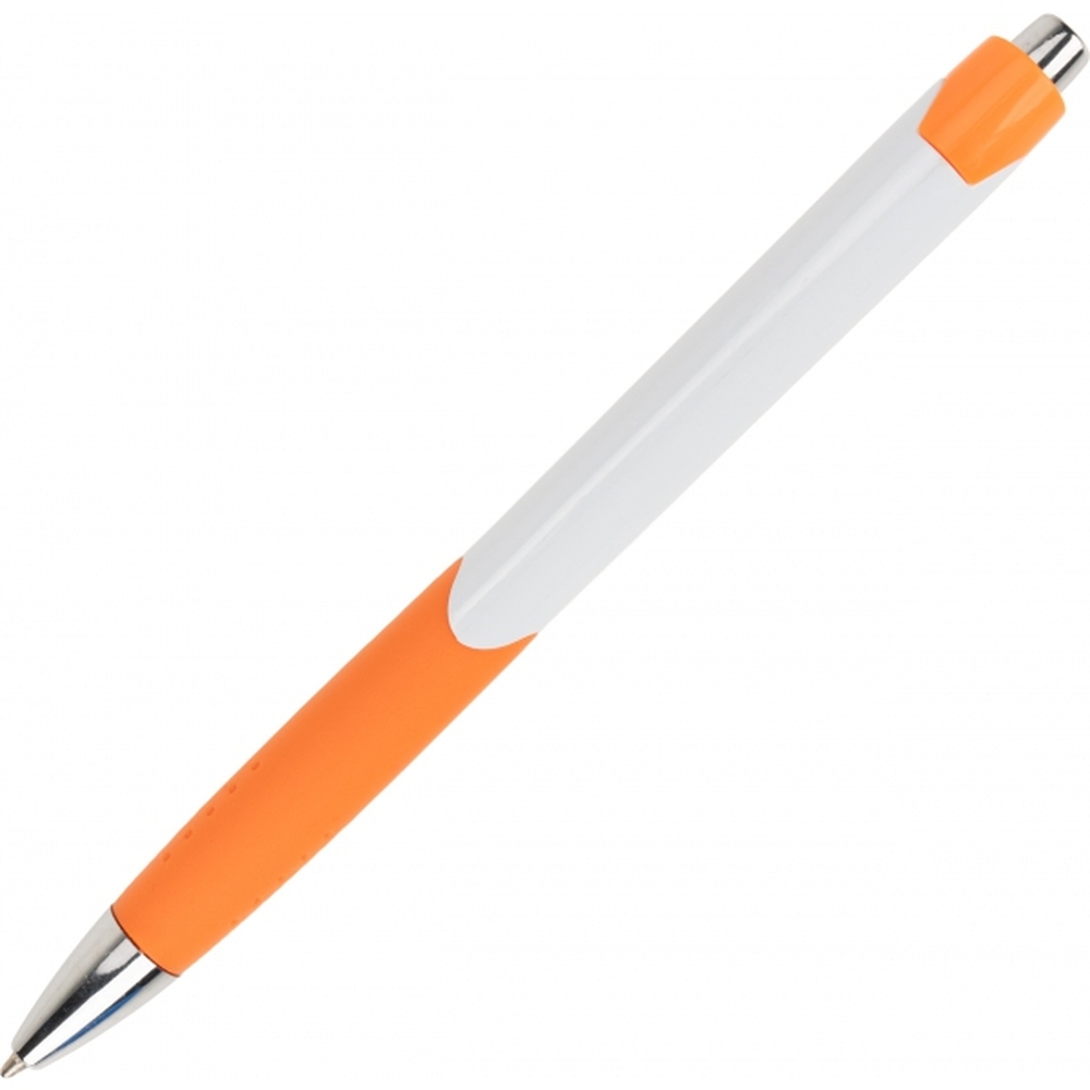 Długopis plastikowy, wyposażony w klips i gumową strefę chwytu oraz niebieski wkład.