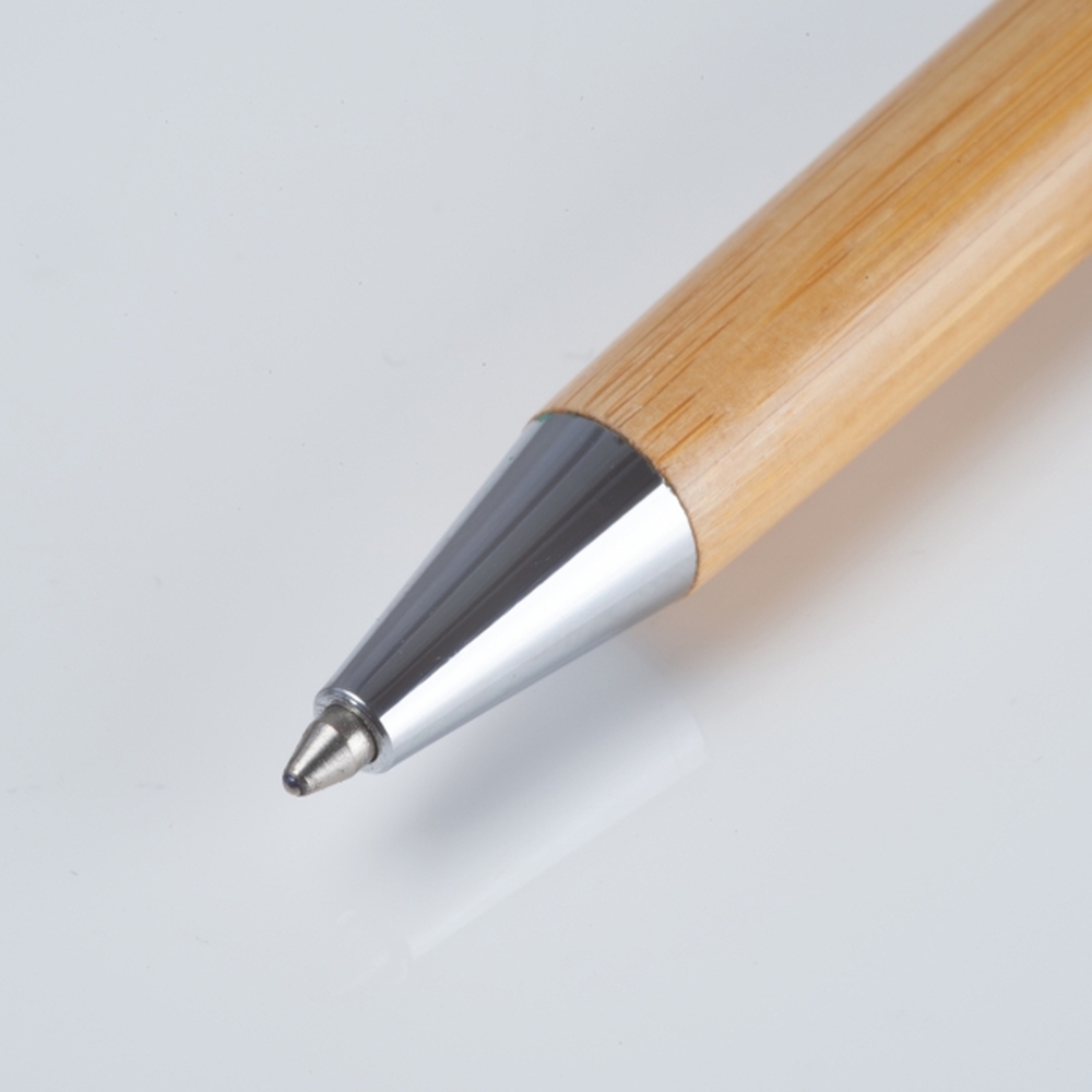 Przekręcany długopis bambusowy, z niebieskim wkładem. Pakowany w dopasowane, bambusowe etui.