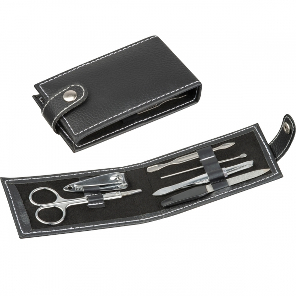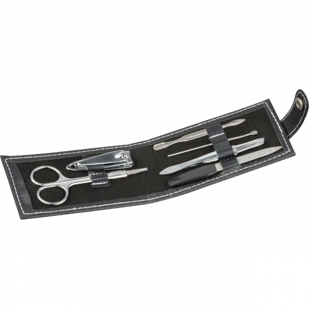 Zestaw do manicure składający się z 7 przyborów, całość zapakowana w skórzane etui.