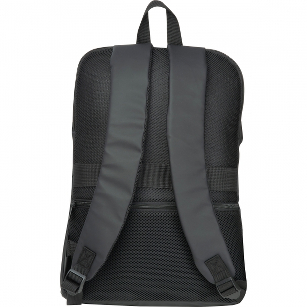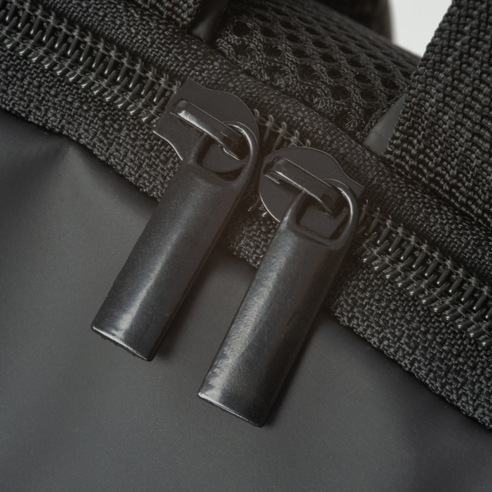Plecak wykonany ze sztucznej skóry z dwoma ukośnymi kieszeniami, zapinanymi za zamek z przodu, uchwytem do przenoszenia, watowanymi szelkami i kieszonką antykradzieżową.