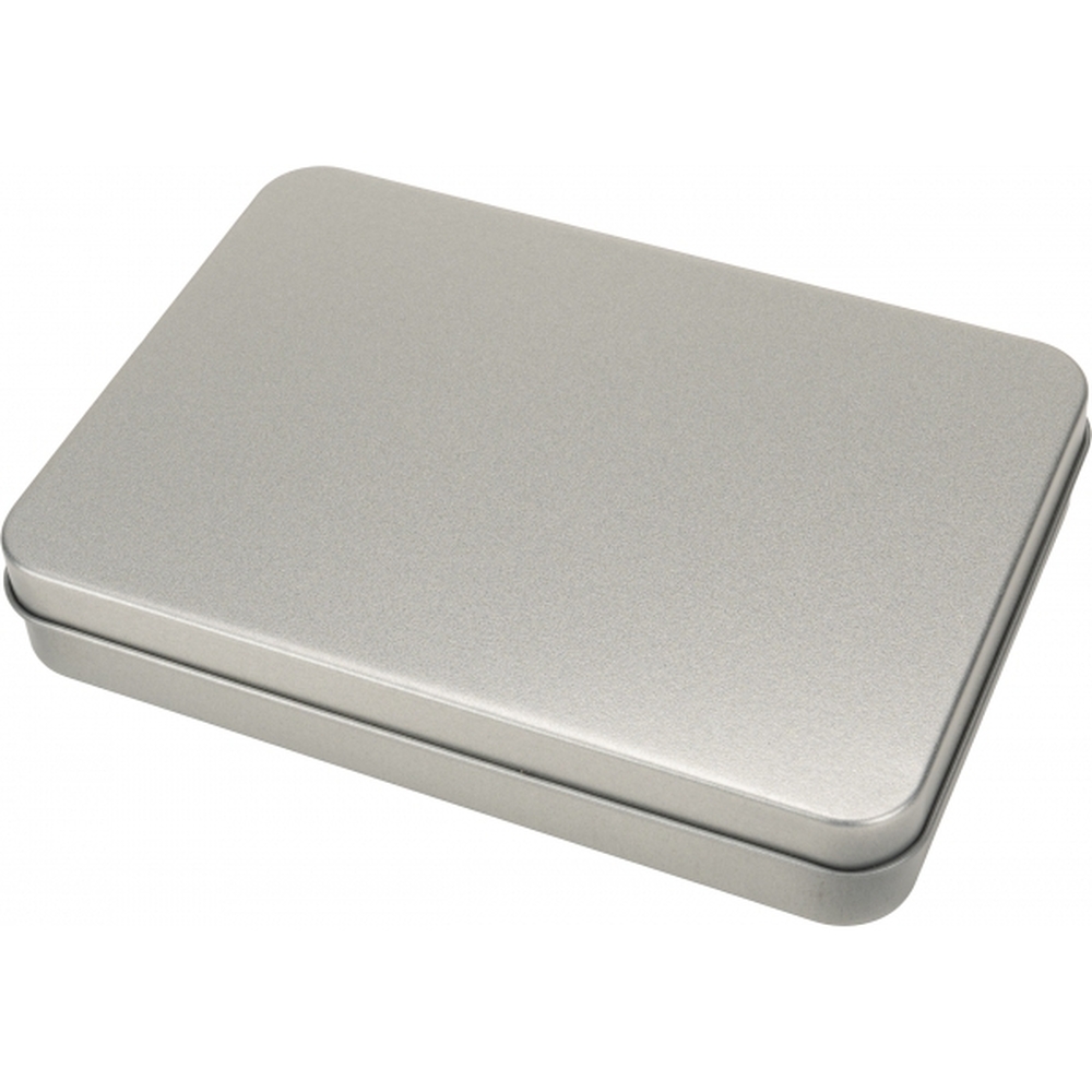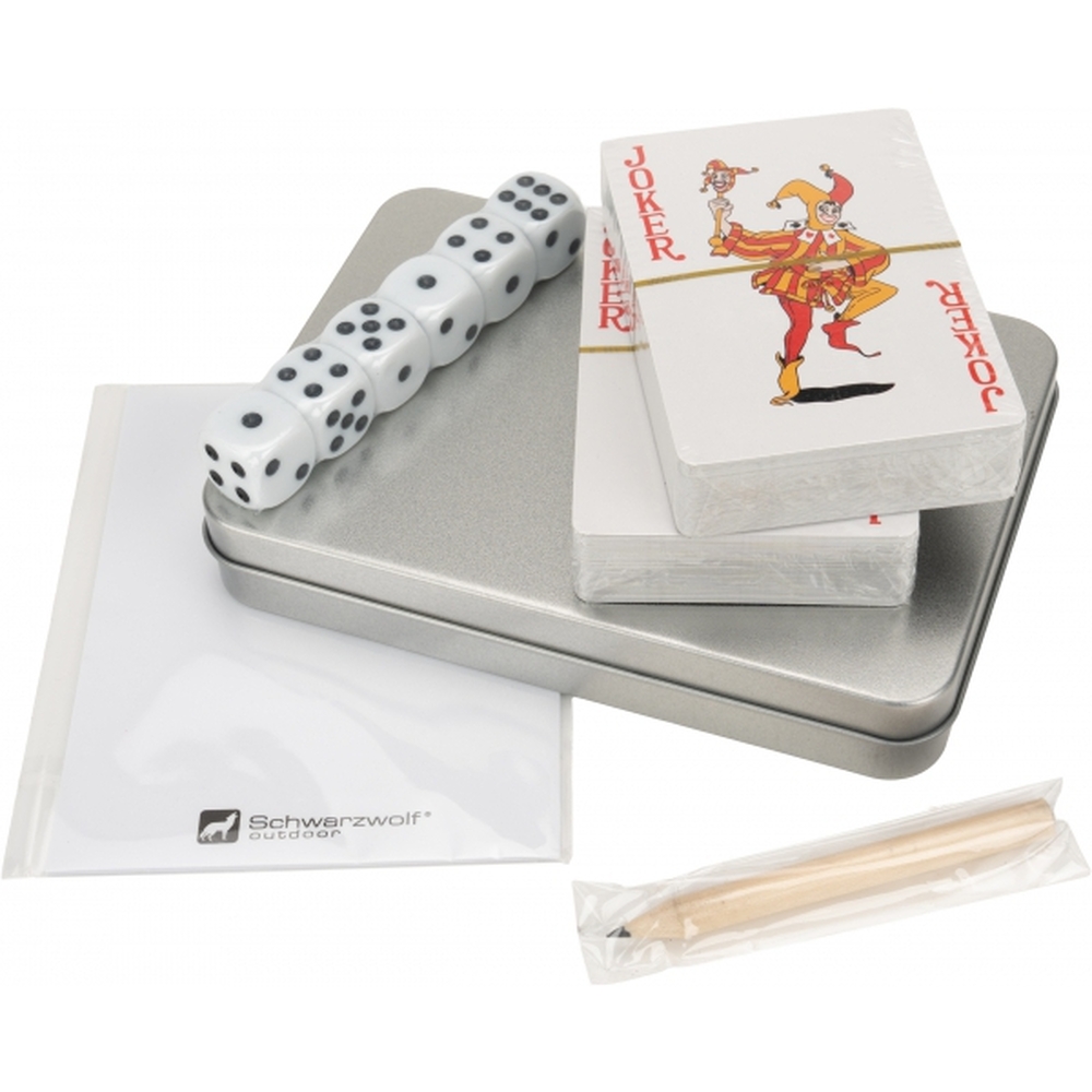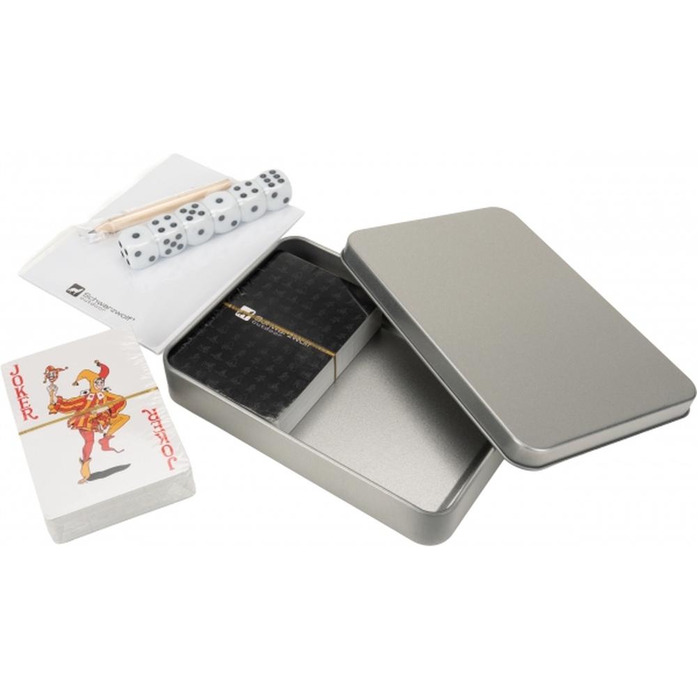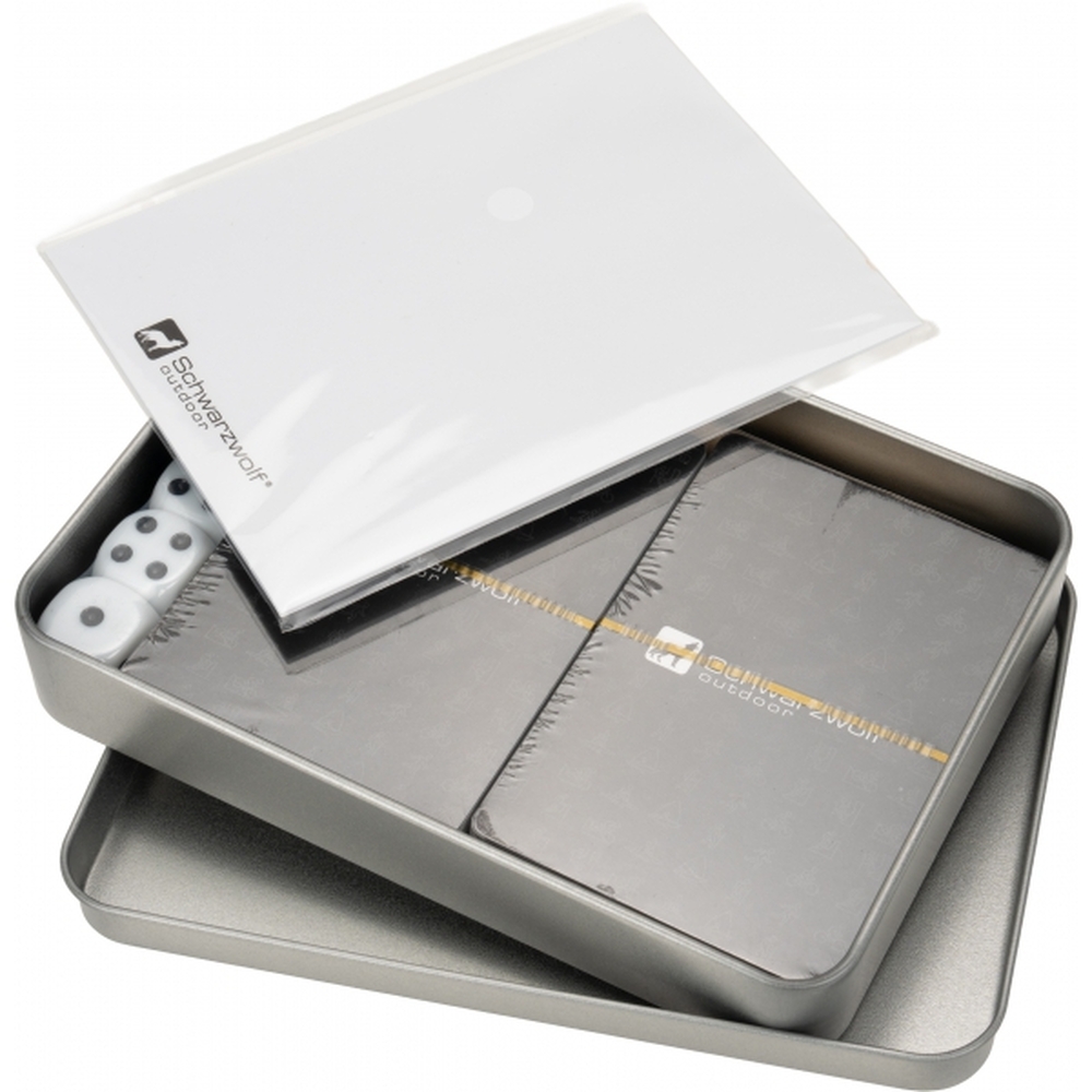 Zestaw podróżny do gry w karty i kości, zapakowany w blaszane pudełko. Zestaw składa się z 2 talii 54 kart z wodoodporną powierzchnią, 6 kości do gry i 15 karteczek do notowania oraz ołówek.