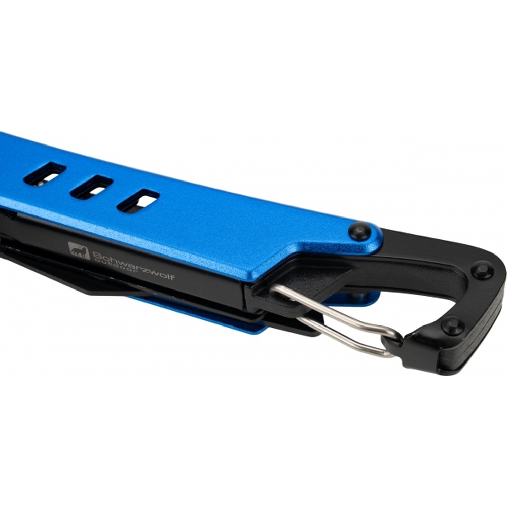 Multi-narzędzie Schwarzwolf zawiera 11 rodzajów narzędzi - nóż, otwieracz do piwa, otwieracz do puszek, szczypce, łuparka, piła, śrubokręt, śrubokręt krzyżakowy, pilnik, ściągacz izolacji. Zestaw narzędzi posiada karabińczyk i jest zapakowany w etui z neoprenu.