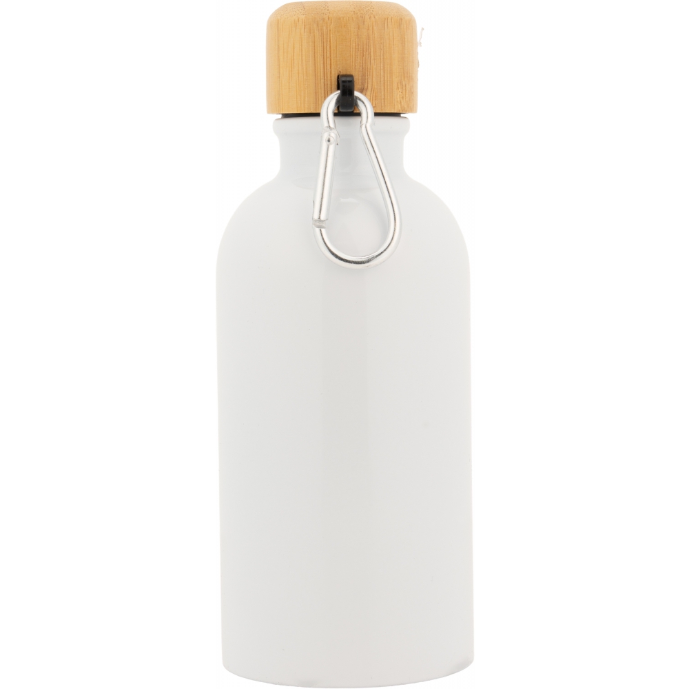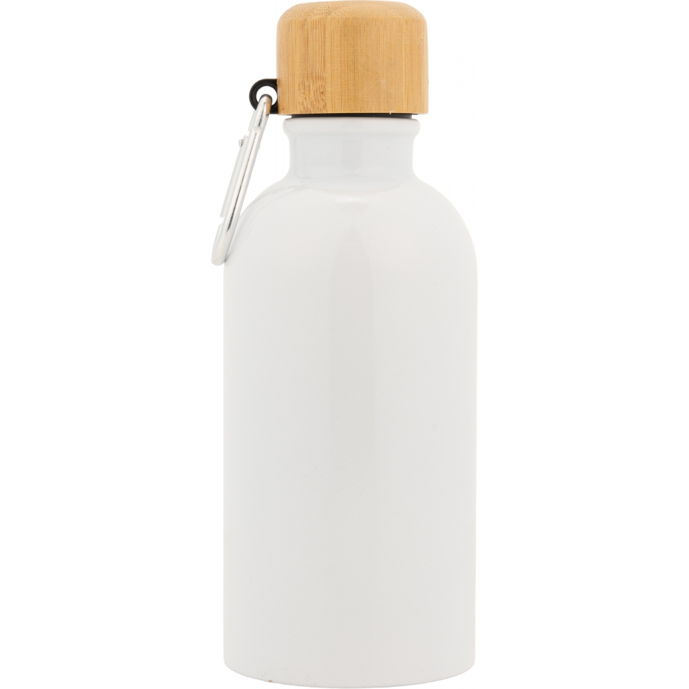 Butelka wykonana ze stali nierdzewnej, o pojemności 400 ml, z bambusową zakrętką do której został przymocowany karabińczyk.