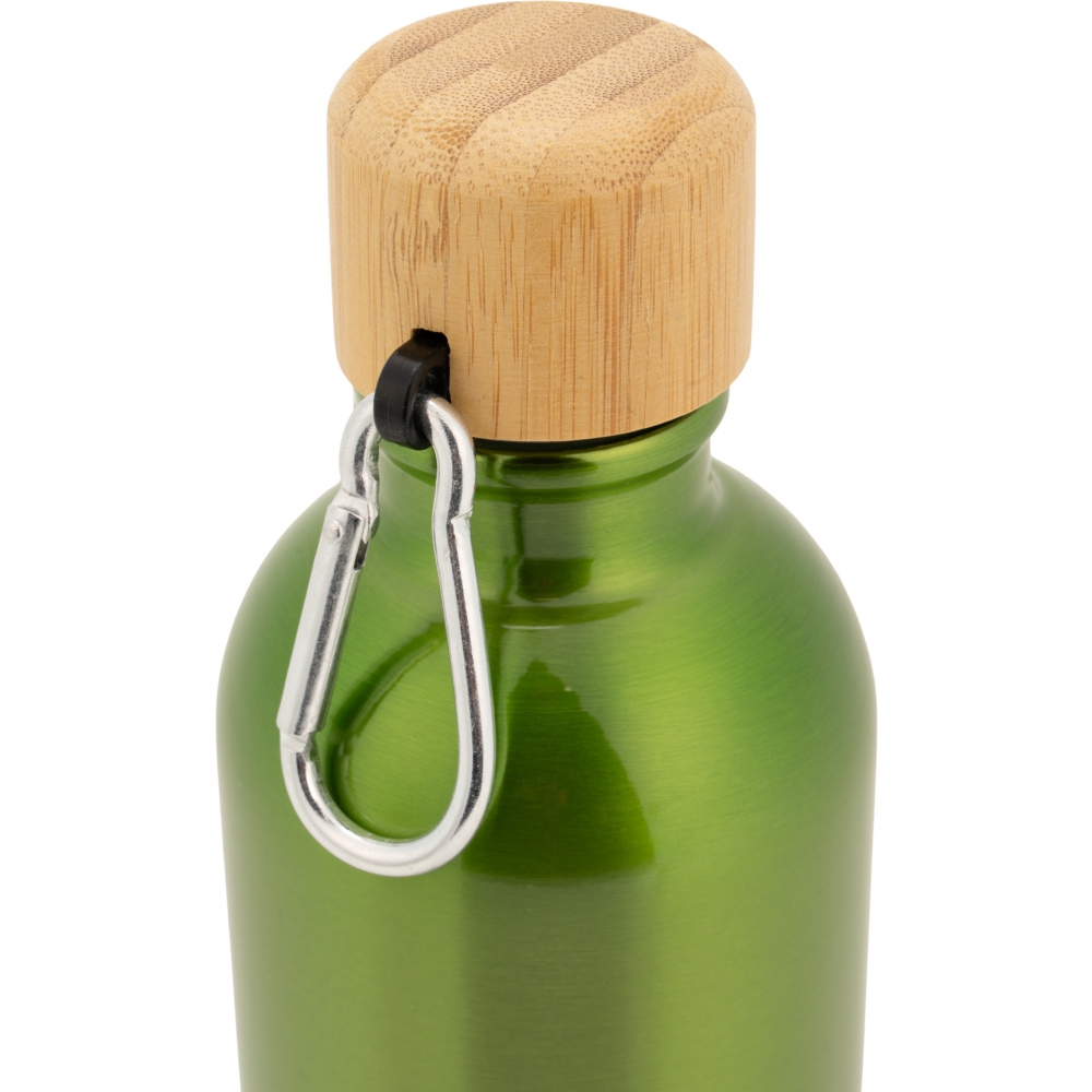 Butelka wykonana ze stali nierdzewnej, o pojemności 400 ml, z bambusową zakrętką do której został przymocowany karabińczyk.