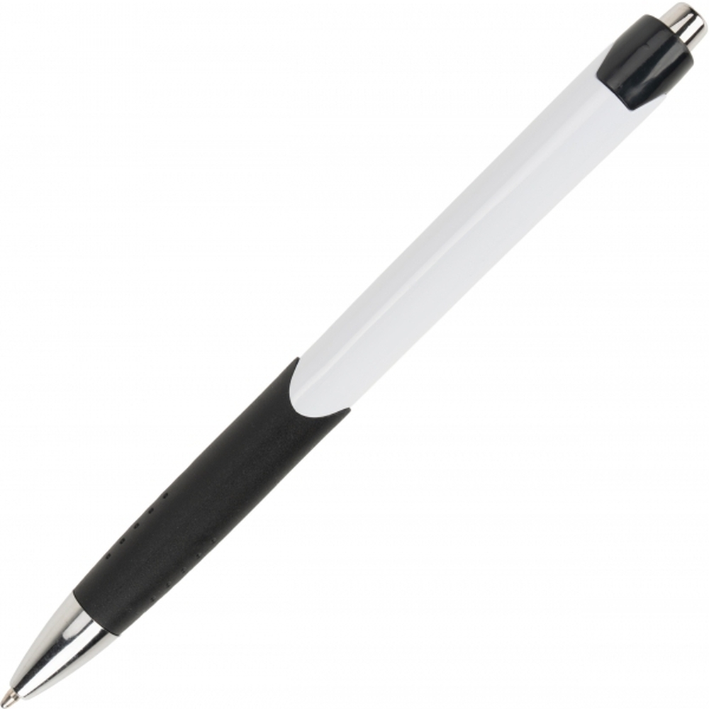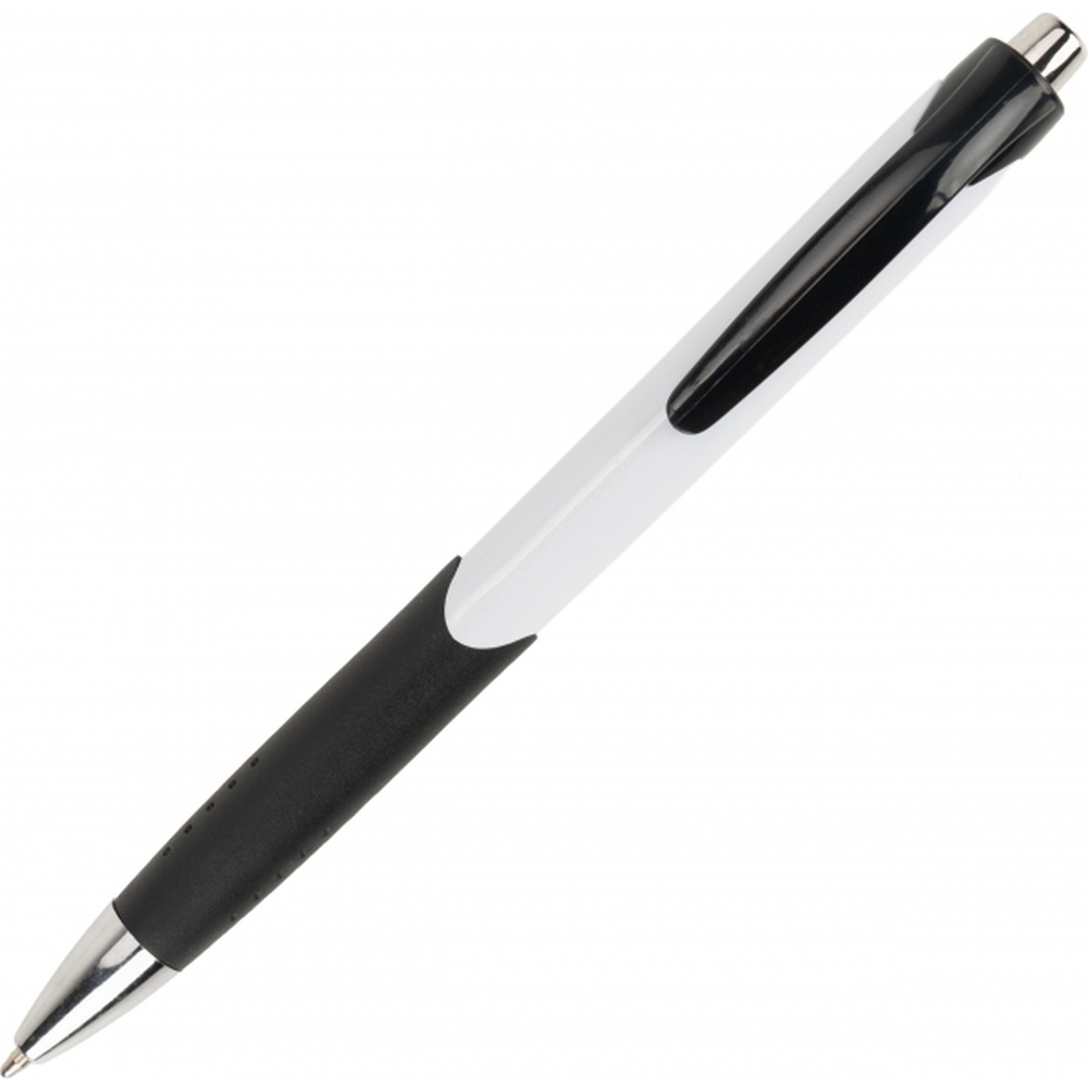 Długopis plastikowy, wyposażony w klips i gumową strefę chwytu oraz niebieski wkład.