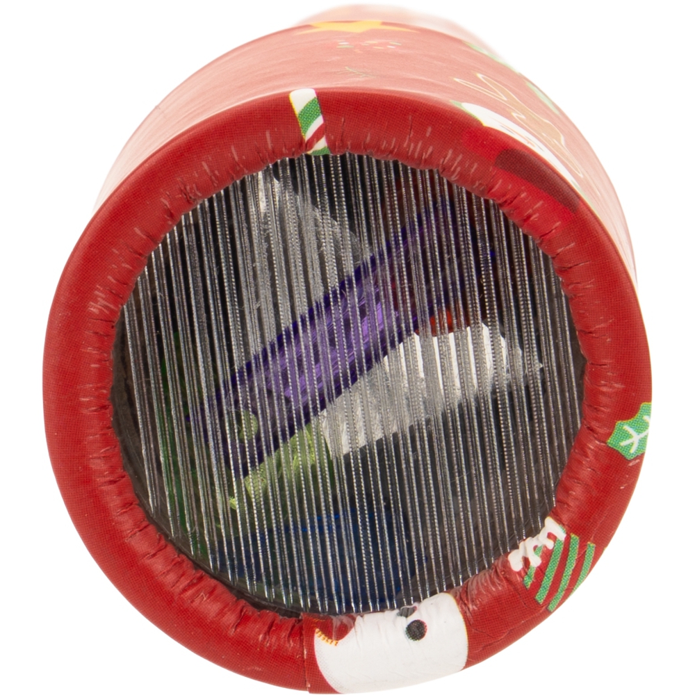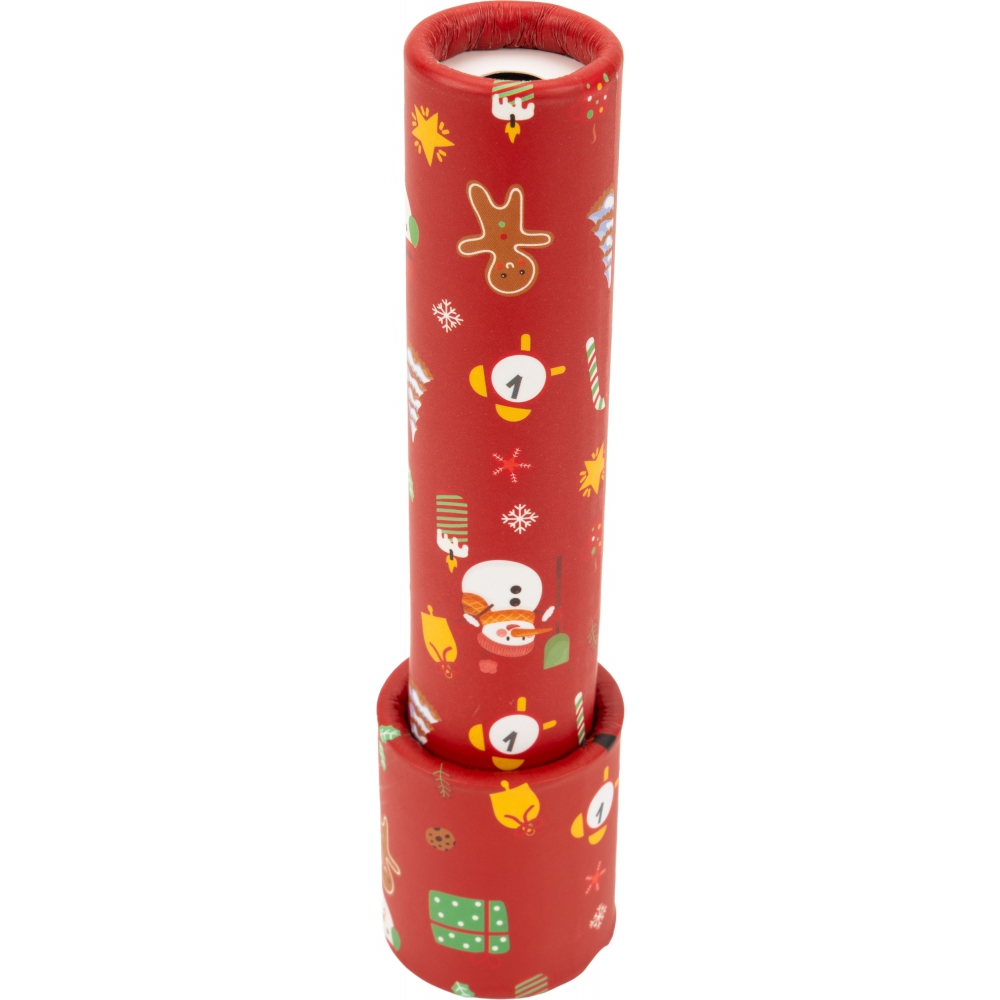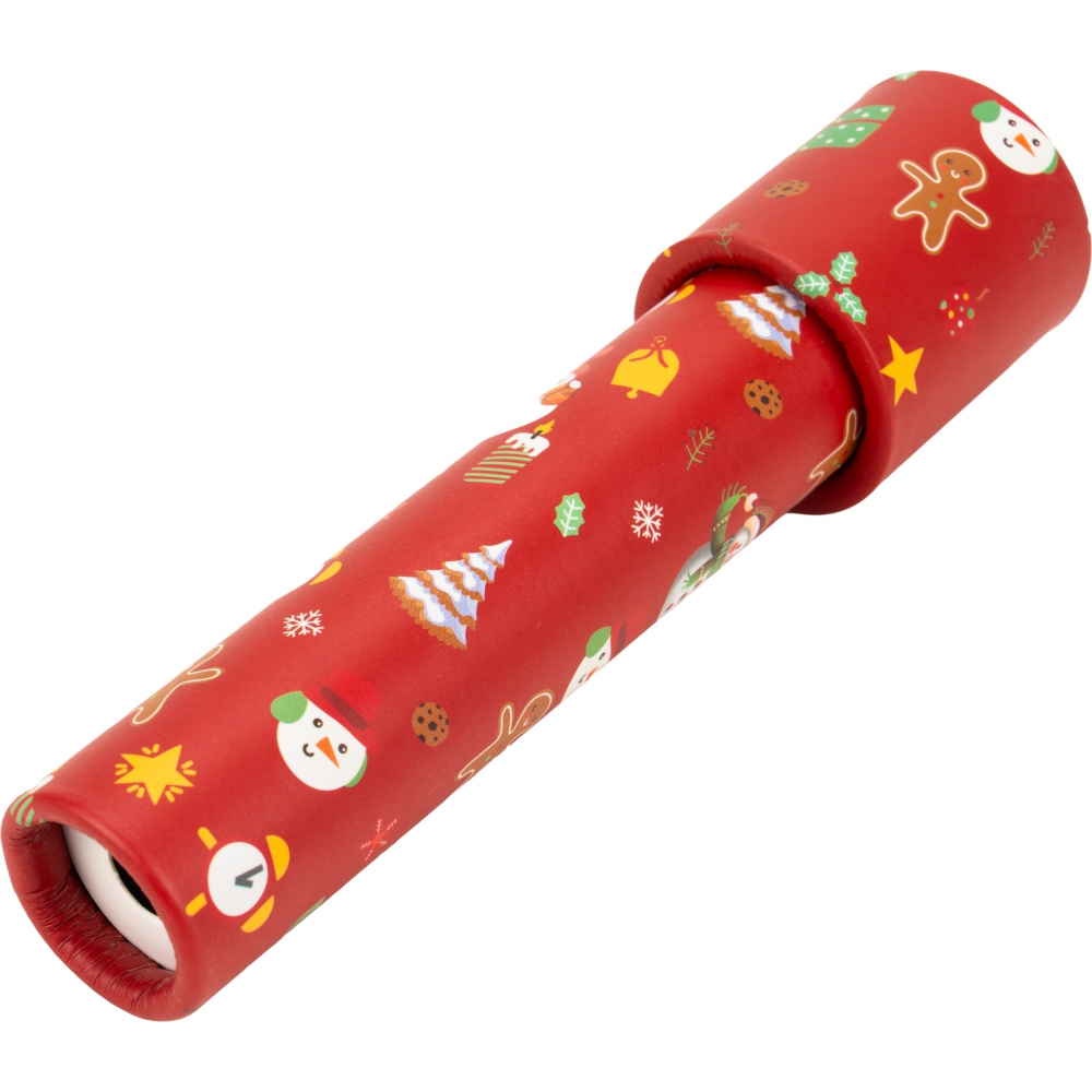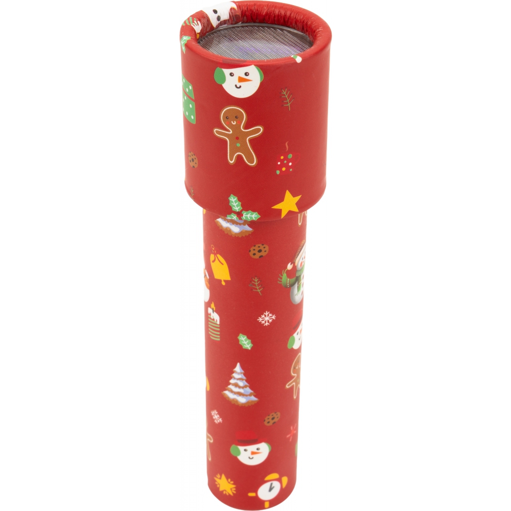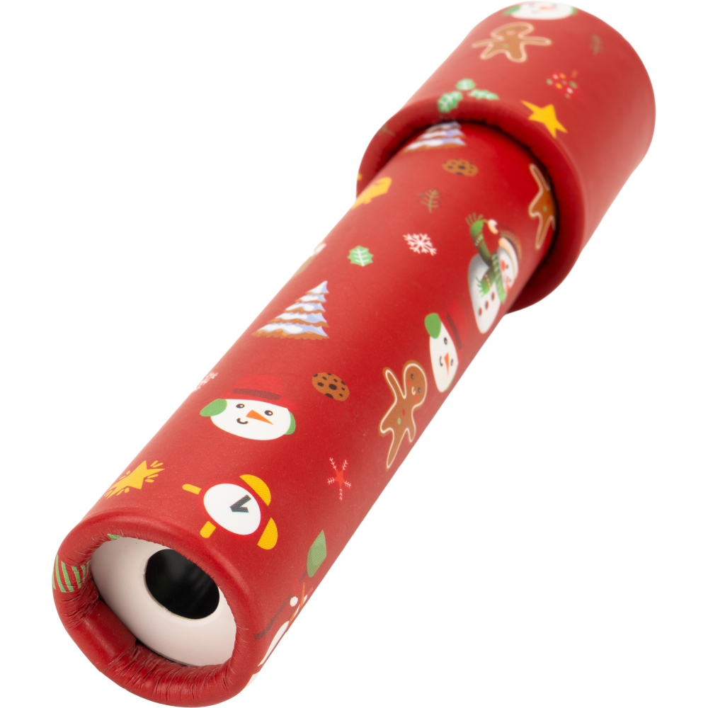 Papierowy kalejdoskop, ze świątecznym wzorem. Gdy spojrzysz do środka, ukaże Ci mozaikę różnobarwnych kształtów, które przemieszczają się przy poruszaniu kalejdoskopem.