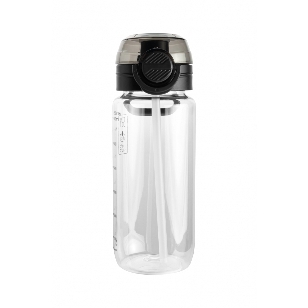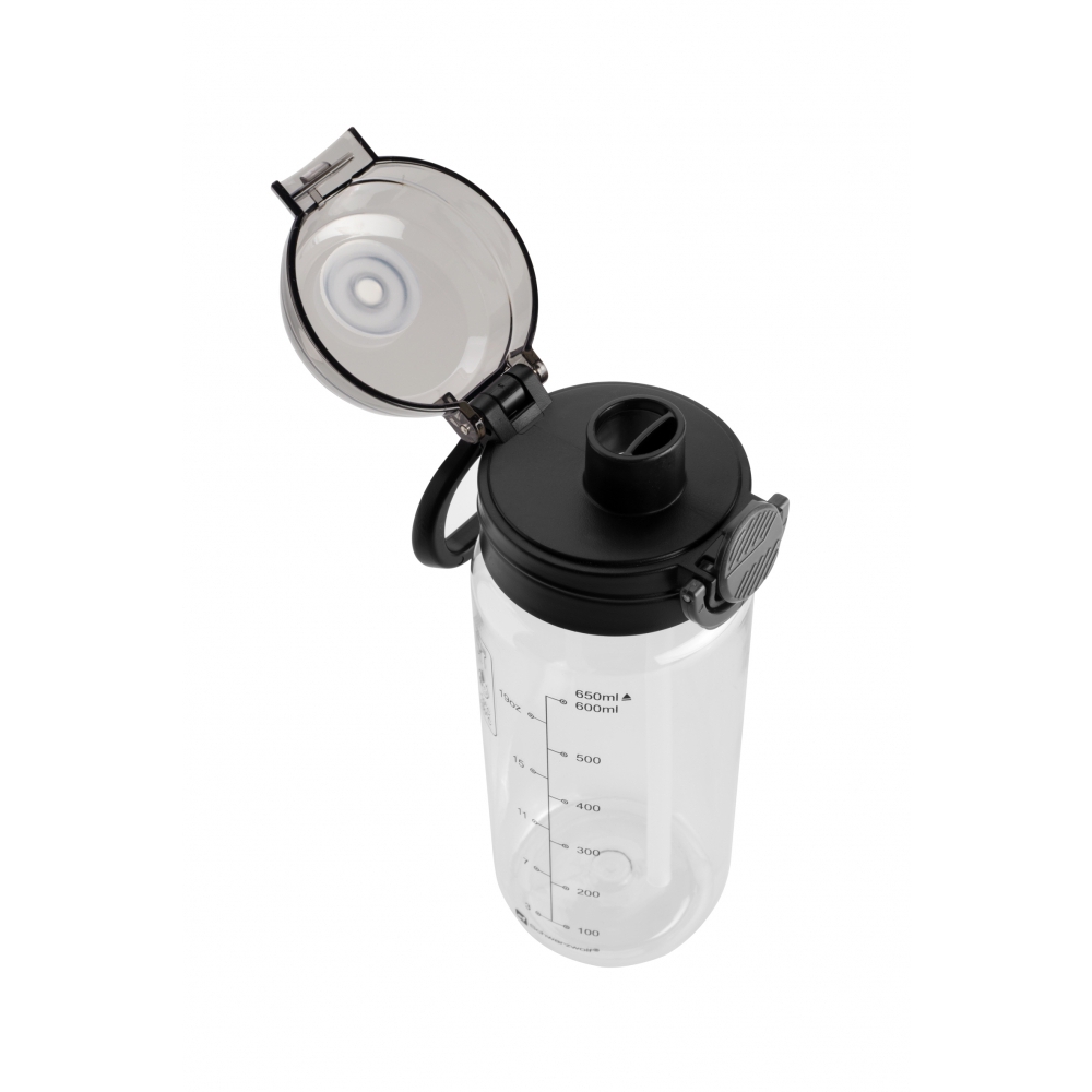 Sportowa butelka Schwarzwolf wykonana z tritanu, w kolorze przezroczystym, z czarną zakrętką i uchwytem do zawieszania. Pojemność butelki wynosi 650 ml, a jej konstrukcja wspiera zdrowy styl życia, ponieważ nie zawiera BPA. Oferuje dwa sposoby picia: przez ustnik lub słomkę. Nadaje się do napojów zimnych i ciepłych w zakresie temperatur od -10°C do 80°C.