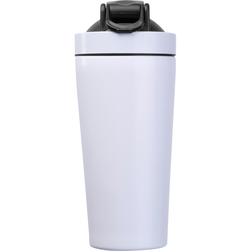 Shaker o pojemności 750 ml do koktajli proteinowych, wykonany ze stali nierdzewnej z recyklingu, wyposażony w metalowe sitko do mieszania.