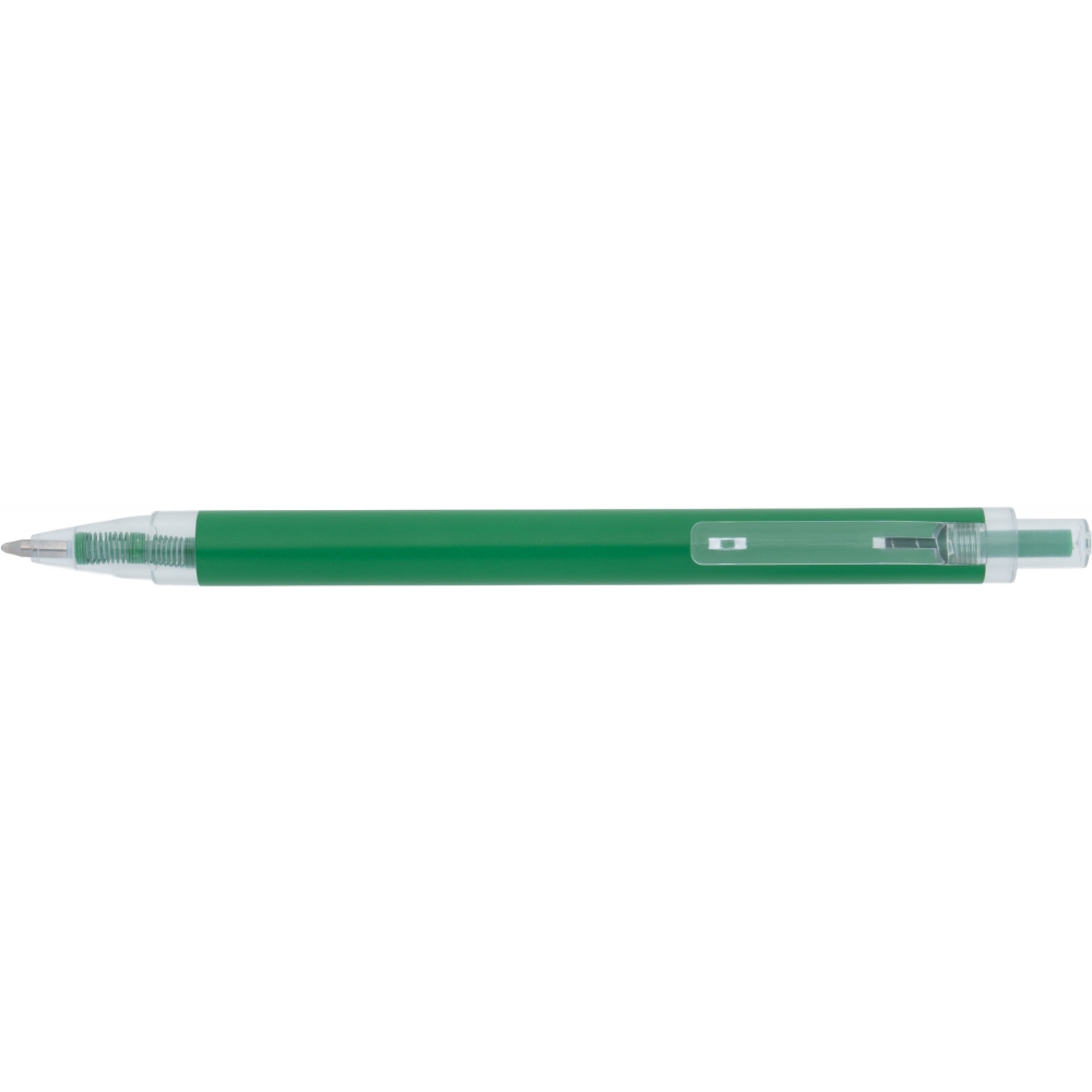 Długopis wykonany z aluminium z recyklingu i RPET, z przezroczystym klipsem i niebieskim wkładem.