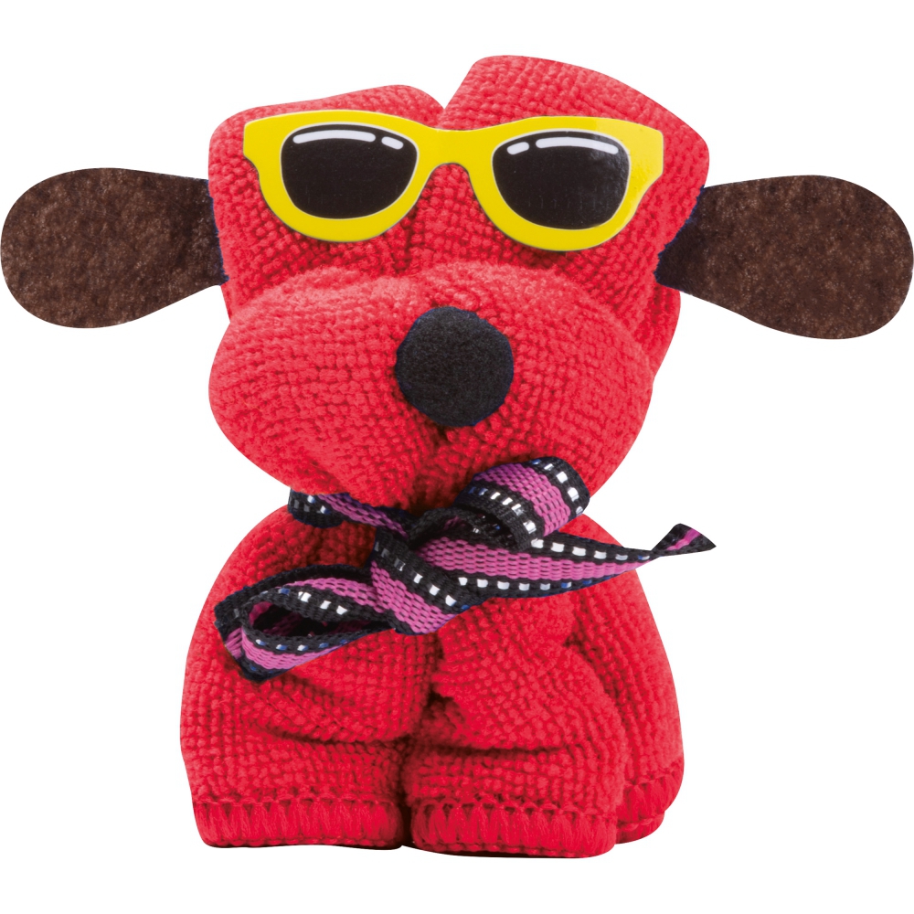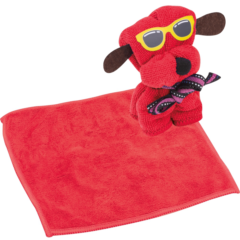 Miękki ręcznik 20 x 20 cm, zawinięty w kształt pieska.