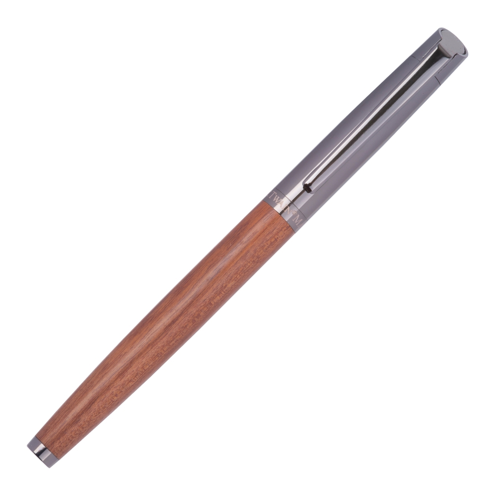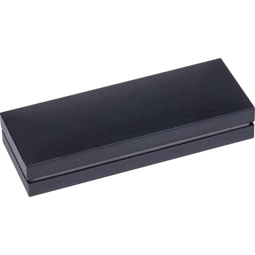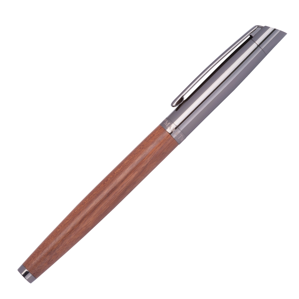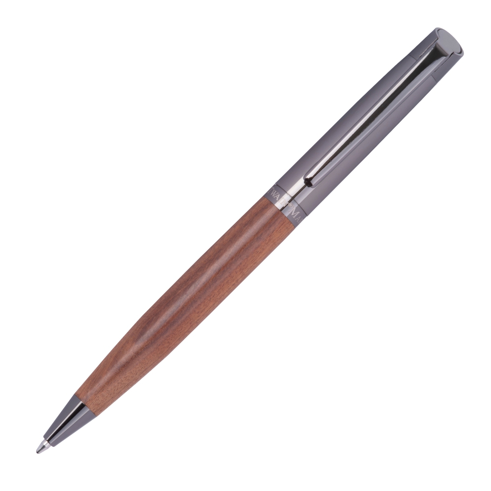 Zestaw piśmienny wykonany ze stali nierdzewnej i drewna, składający się z długopisu (1200 m długość pisania) i pióra kulkowego (400 m długość pisania), oba z niebieskim wkładem. Całość zapakowana w eleganckie pudełko.