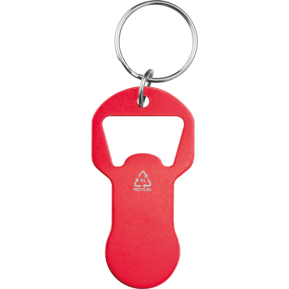Brelok do kluczy wykonany z aluminium z recyklingu, wyposażony w otwieracz do butelek oraz żeton do wózka sklepowego. Lekki, praktyczny i doskonały do codziennego użytku.