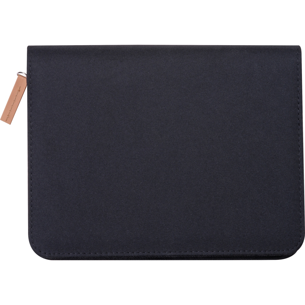 Teczka na dokumenty o formacie A5, wykonana z poliestru z recyklingu, wyposażona w zamek błyskawiczny oraz wyjmowany notes z 144 stronami w linie, wykonanymi z papieru z trzciny cukrowej. Wewnątrz teczki znajduje się duża komora na dokumenty oraz mniejsze kieszonki na akcesoria.