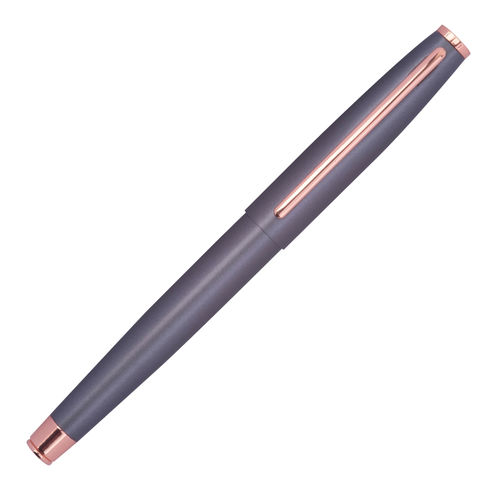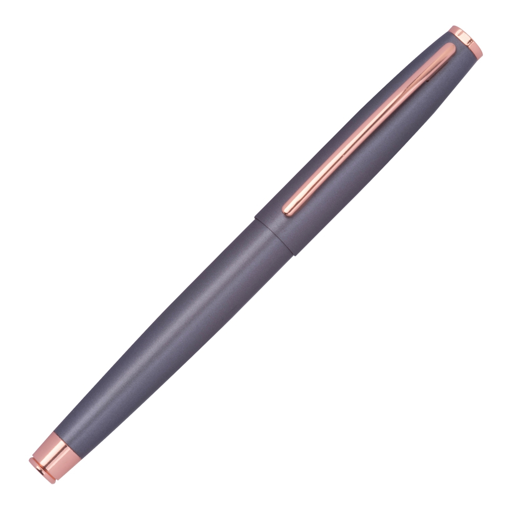 Zestaw piśmienniczy CrisMa wykonany z metalu, składający się z obrotowego długopisu (o długości pisania do 800 m) oraz pióra kulkowego (o długości pisania do 500 m), zdobionych różowozłotymi detalami. Oba przybory piszą w kolorze niebieskim i są zapakowane w eleganckie, czarne pudełko.