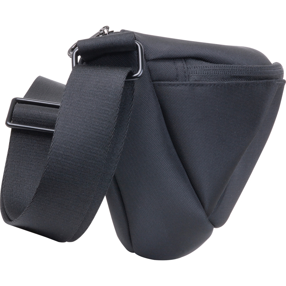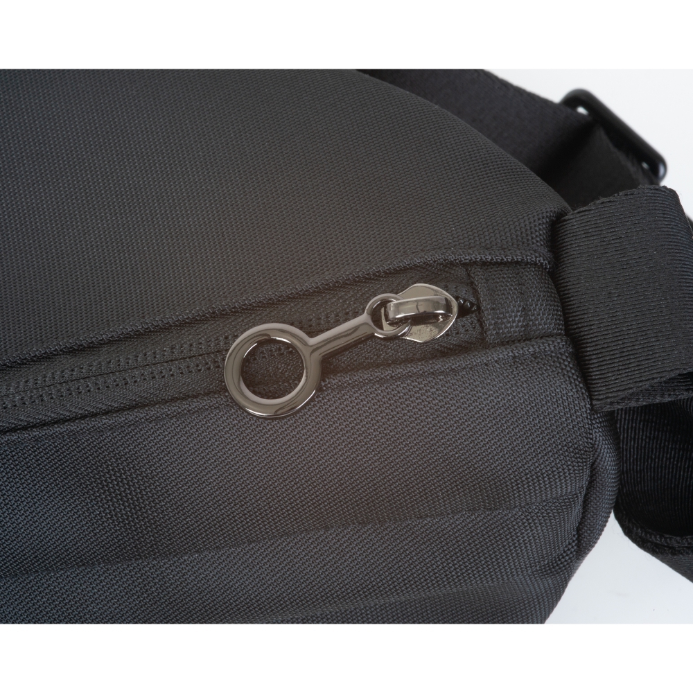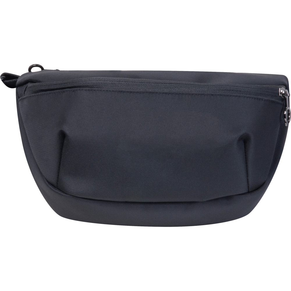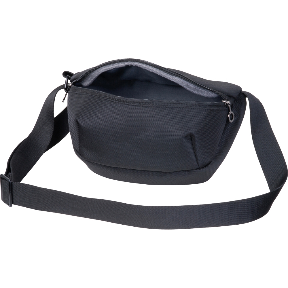 Nylonowa saszetka z detalami w kolorze gun metal, pas można regulować do długości 115 cm.