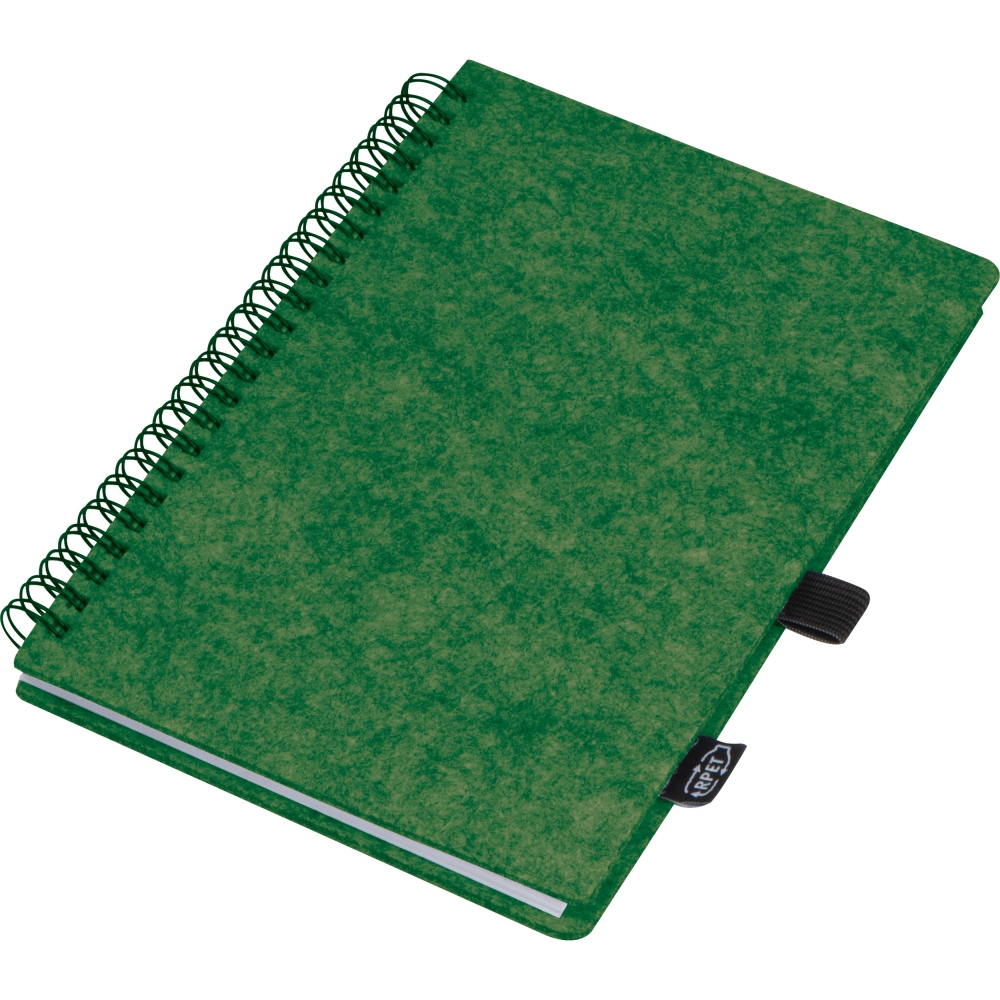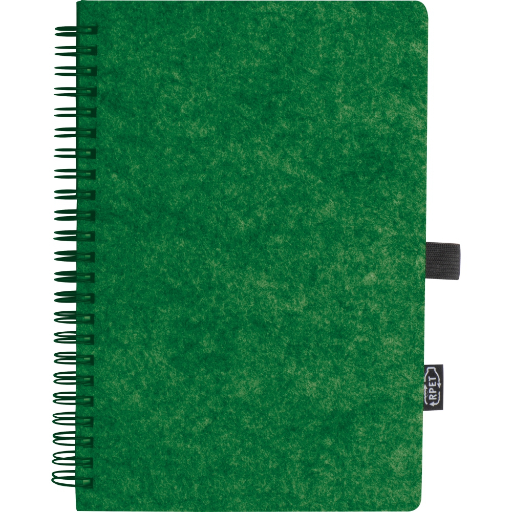 Notes wykonany z filcu RPET, o formacie A5 z 160 stronami w linie. Notes posiada spiralną oprawę i pętelkę na długopis.
