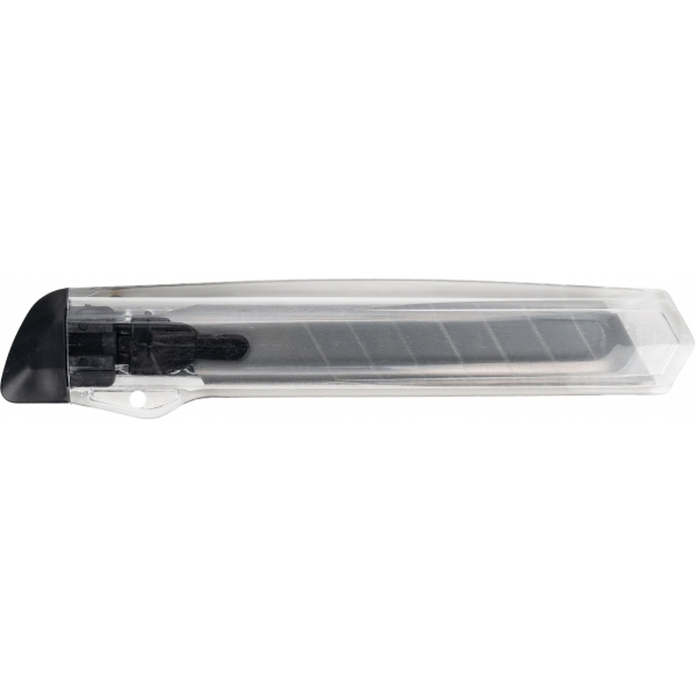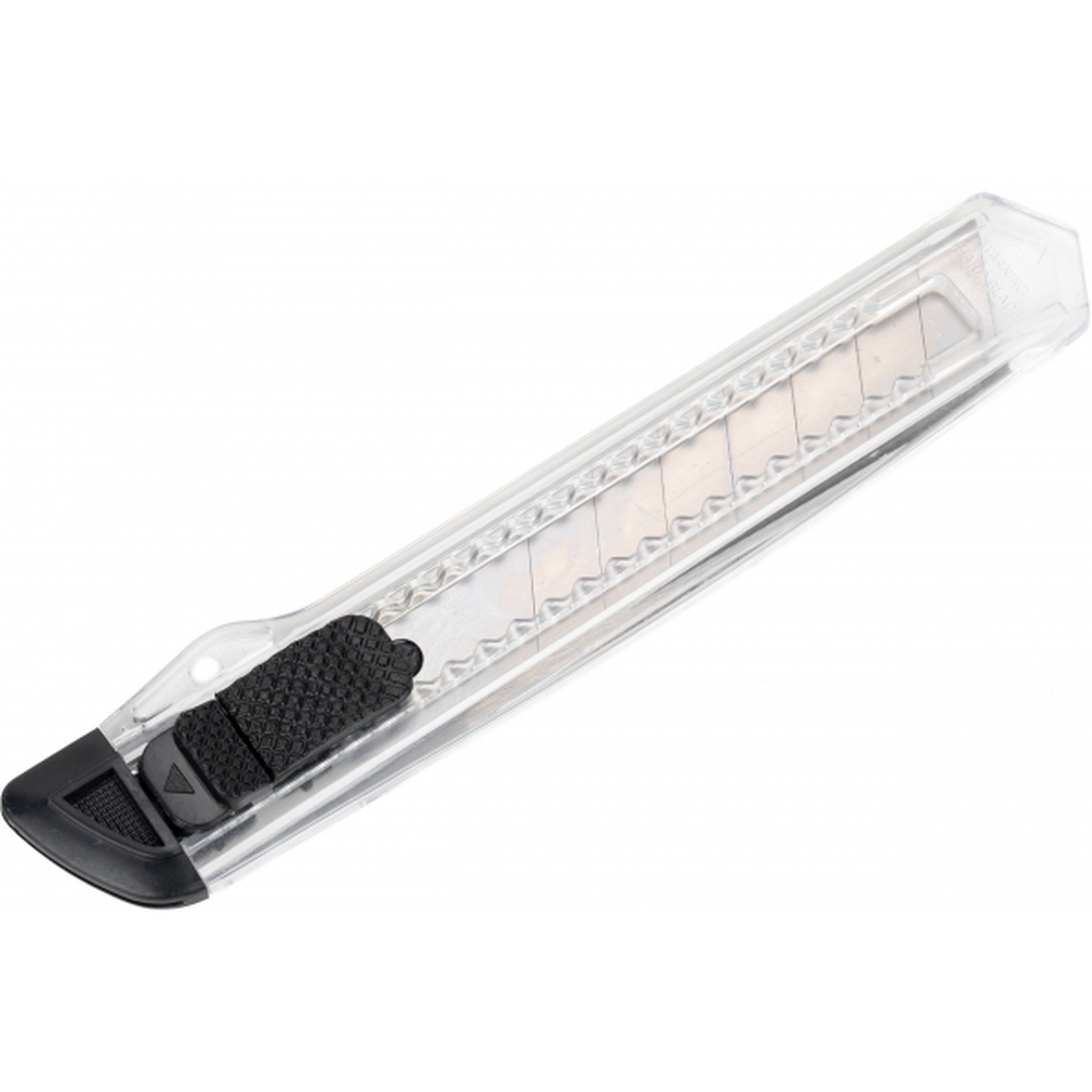 Transparentny nóż do kartonu z kolorową końcówką i łamanym ostrzem, w plastikowej obudowie.
