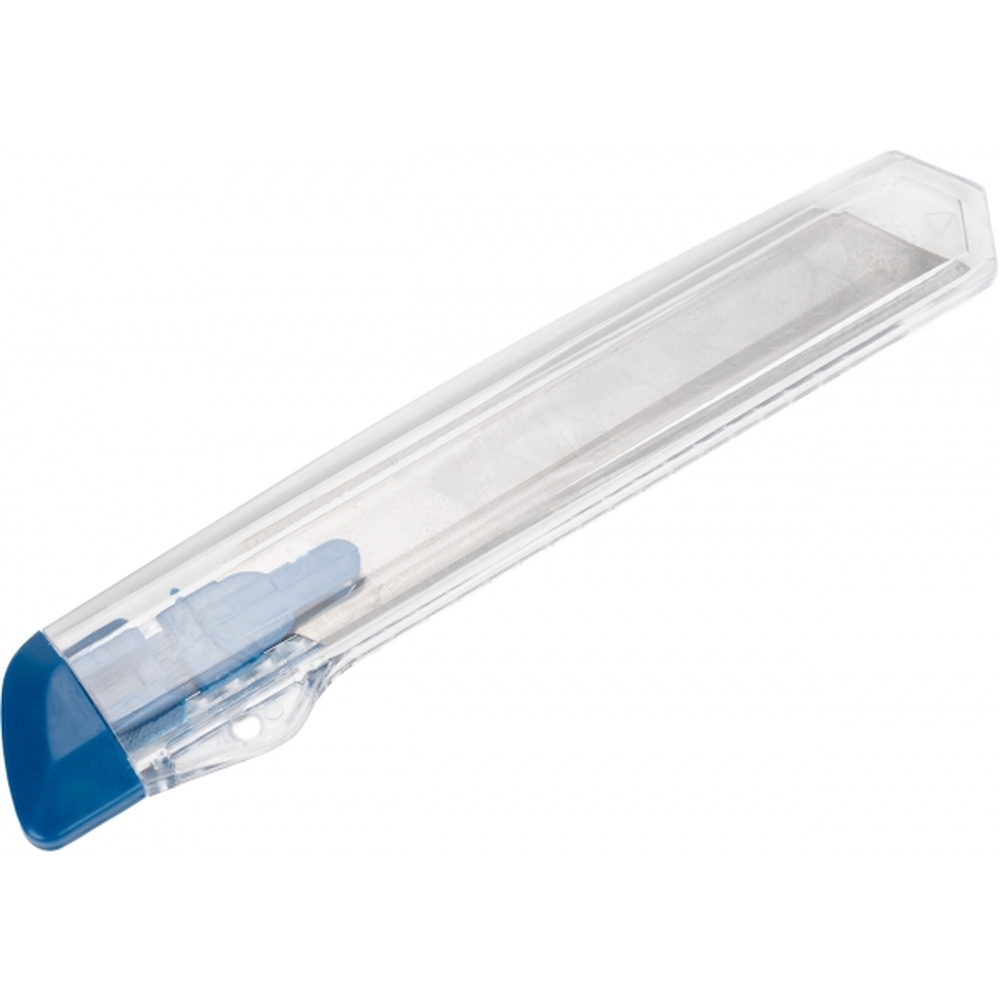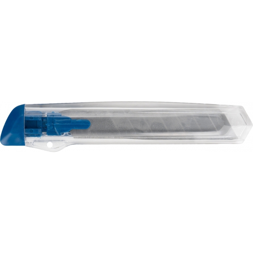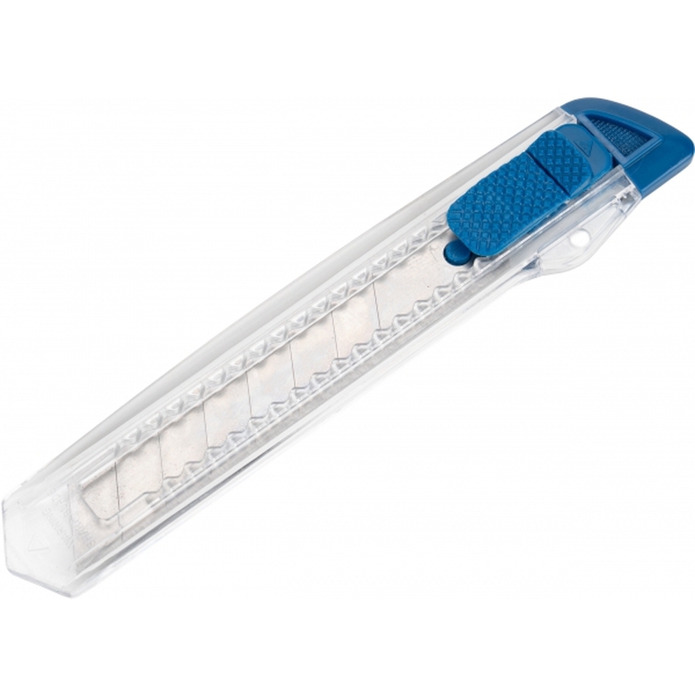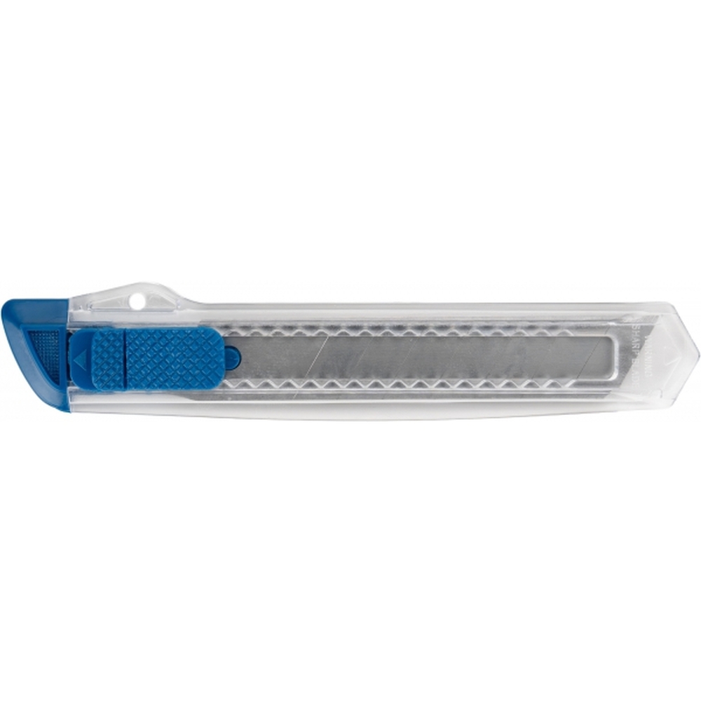 Transparentny nóż do kartonu z kolorową końcówką i łamanym ostrzem, w plastikowej obudowie.