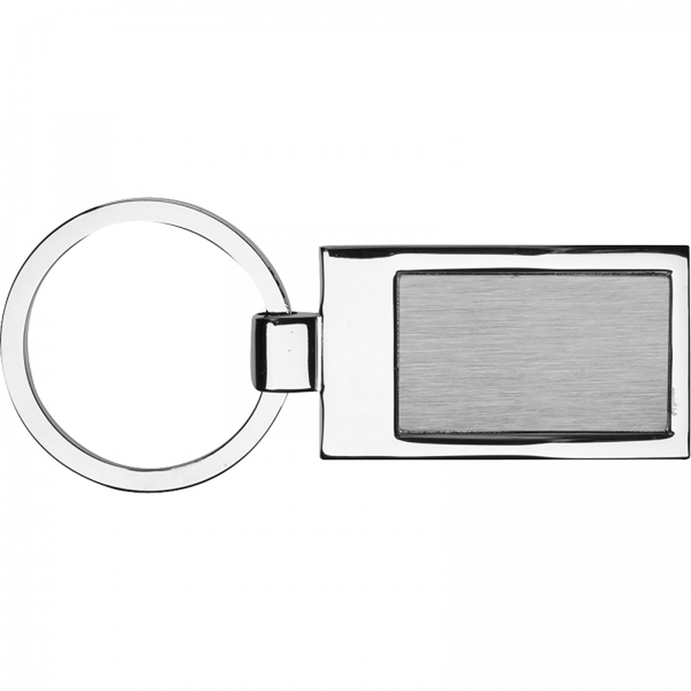 Prostokątny brelok metalowy, ze środkową częścią z metalu szczotkowanego.