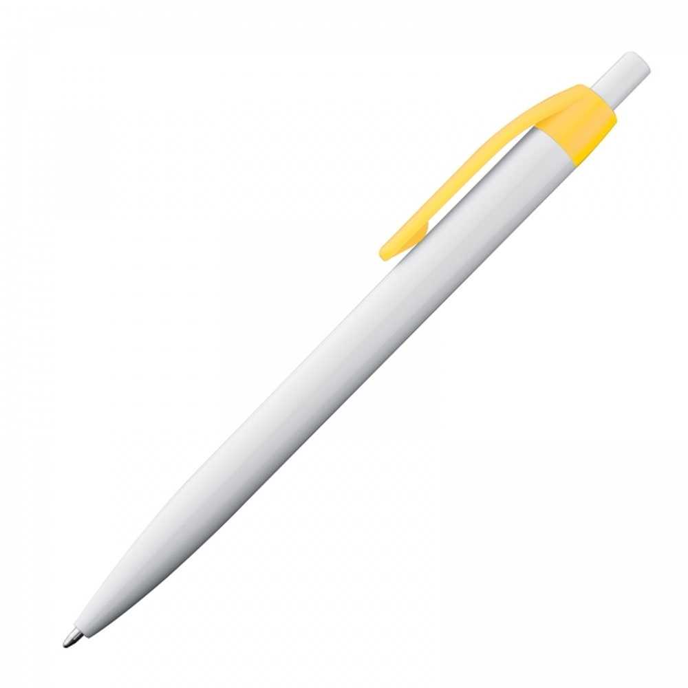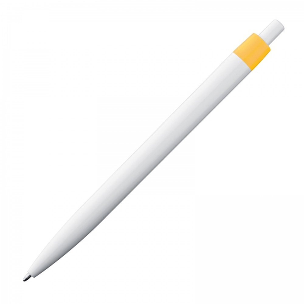 Plastikowy długopis z białym korpusem o klasycznym kształcie, wyposażony we wkład piszący na niebiesko.