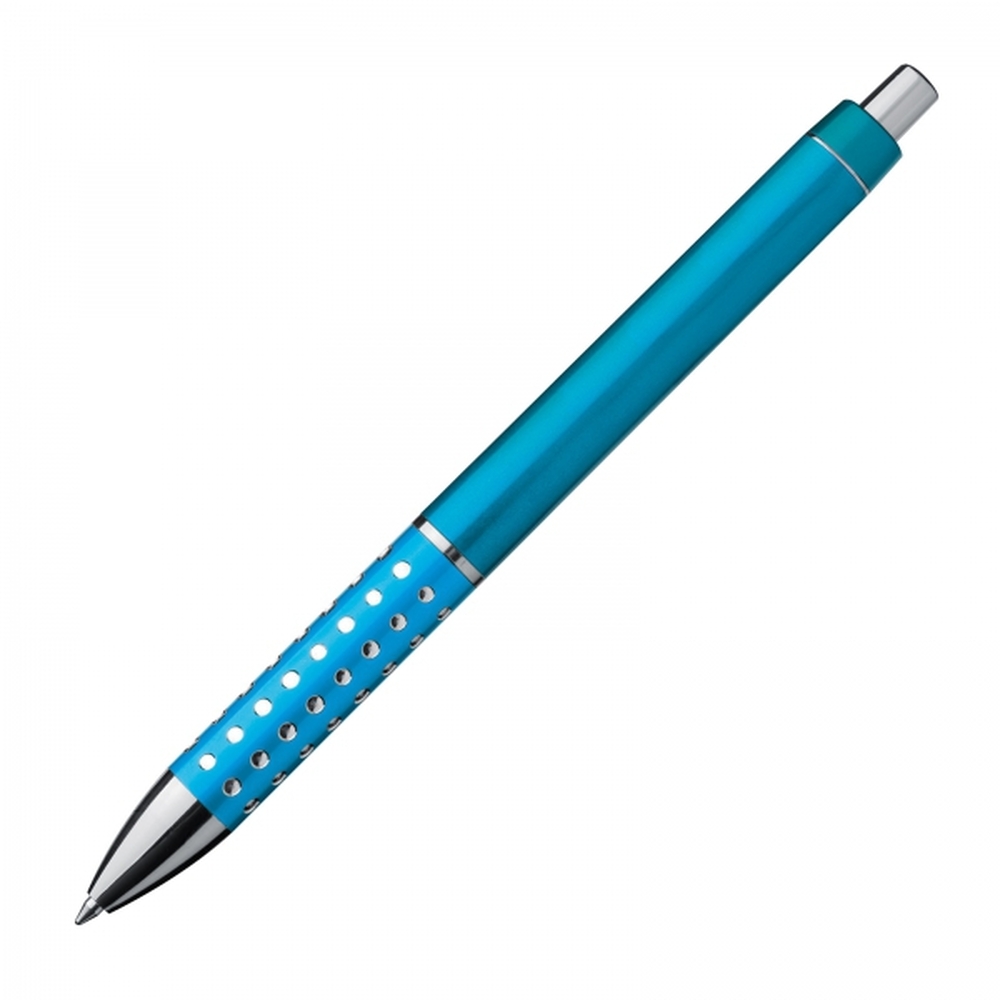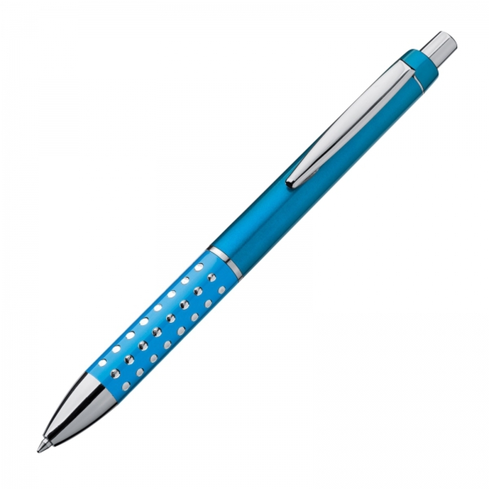 Plastikowy długopis o ozdobnym korpusie, z wkładem piszącym na niebiesko.