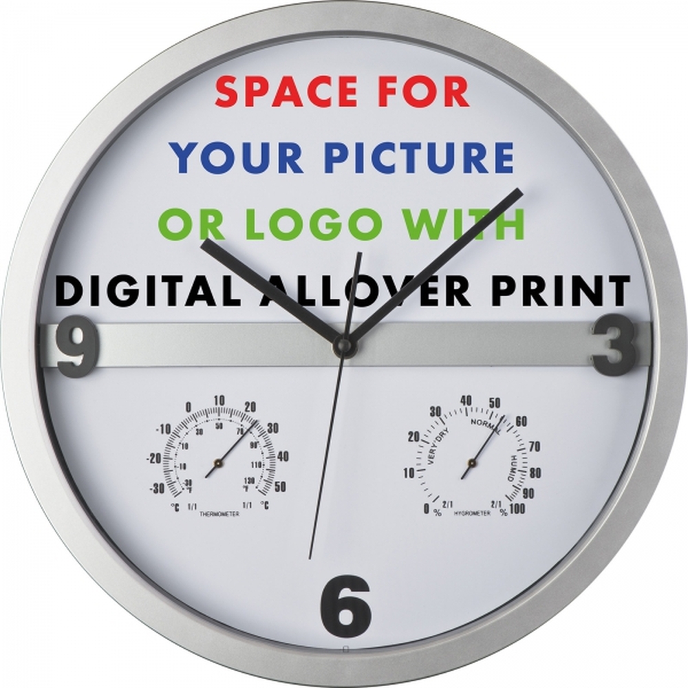 Minimalistyczny, designerski zegar. Wytrzymała obudowa. Dużo miejsca na nadruk na samej tarczy. Cichy mechanizm. Dodatkowy wskażnik temperatury i wilgotności powietrza. Brak baterii w zestawie.