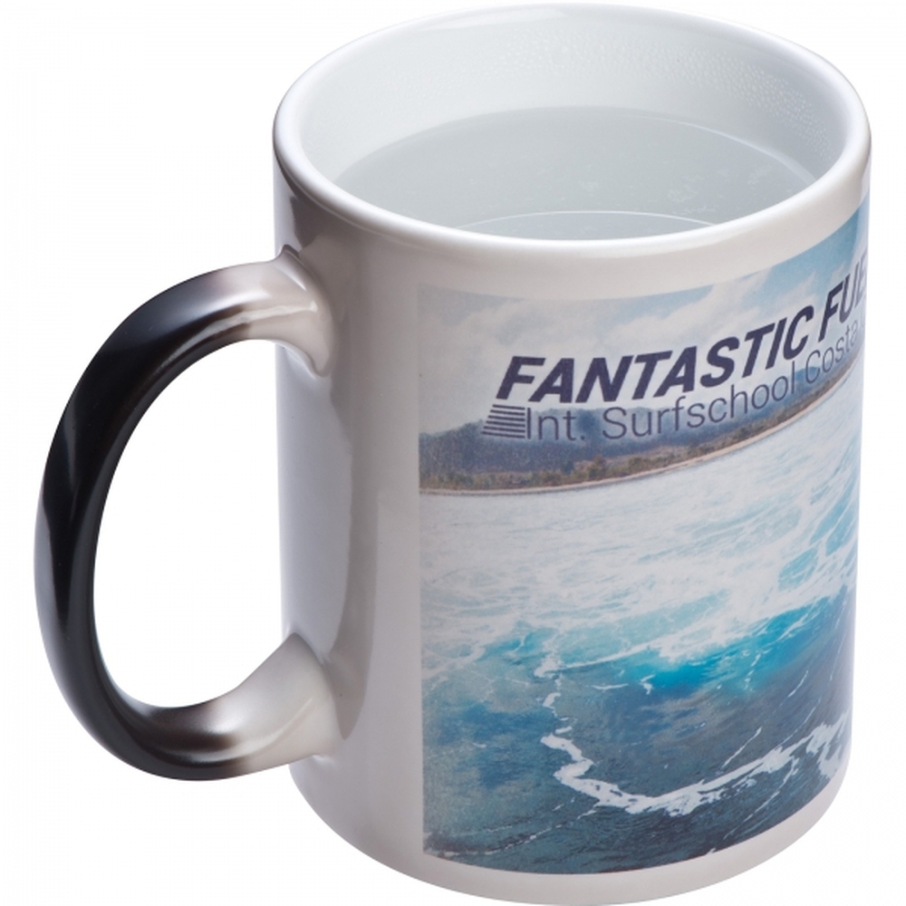Efektowny kubek ceramiczny do sublimacji - kiedy jest zimny, nie widać nadruku, ale po wypełnieniu go ciepłym napojem reklama staje się widoczna. Zalecane mycie ręczne.