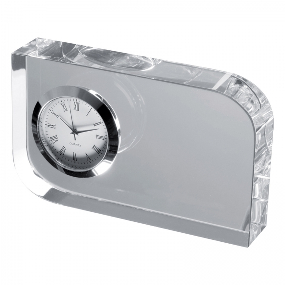 Szklany blok na biurko z zegarem. Metodą graweru laserowego można umieścić na nim tekst gratulacji lub życzenia. Zapakowany w ozdobne pudełko wyściełane satyną. Produkt zawiera baterie.