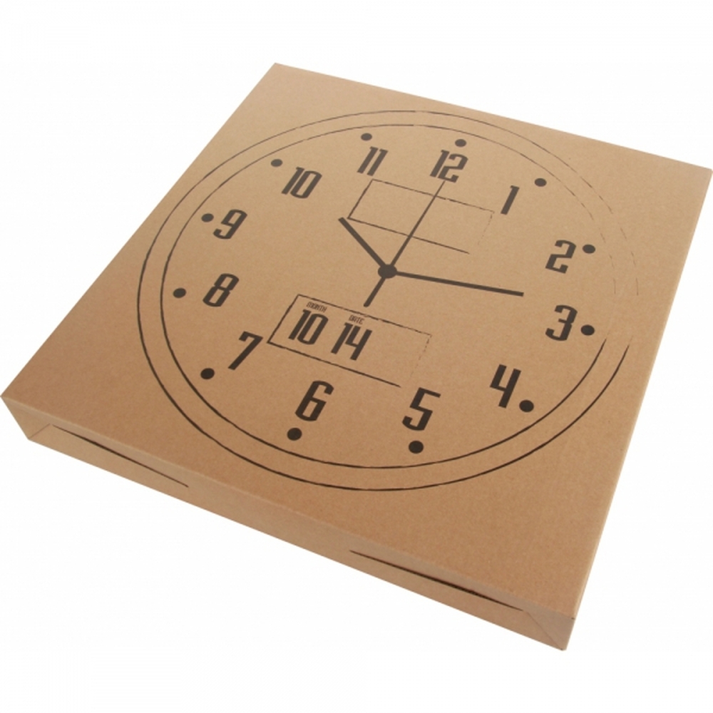 Analogowy zegar ścienny CrisMa z dużym, cyfrowym wyświetlaczem, pokazującym datę, dzień tygodnia oraz temperaturę. Logotyp można umieścić na specjalnym panelu reklamowym, pod ochronną szybką zegara.