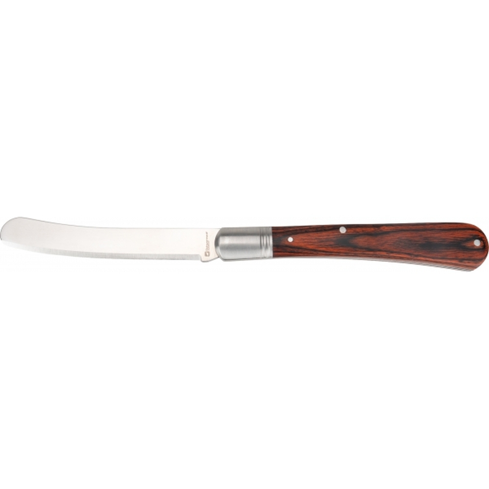 Składany nóż do masła, wykonany ze stali nierdzewnej, z drewnianą rękojeścią. Przydatny podczas podróży.