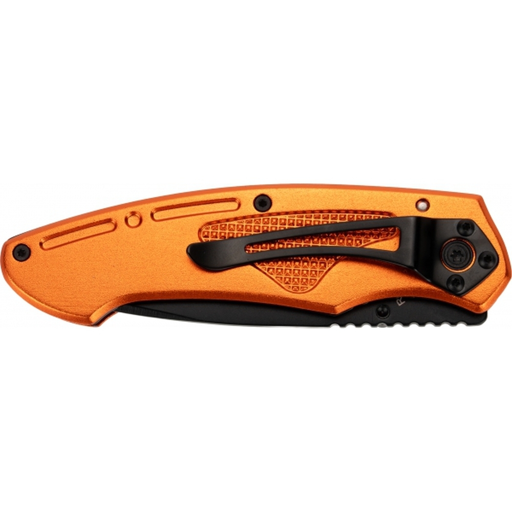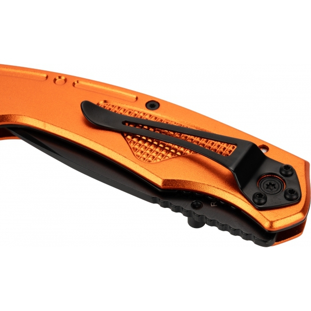 Nóż kieszonkowy wykonany ze stali nierdzewnej z aluminiową rękojeścią i klipsem do mocowania na pasku.