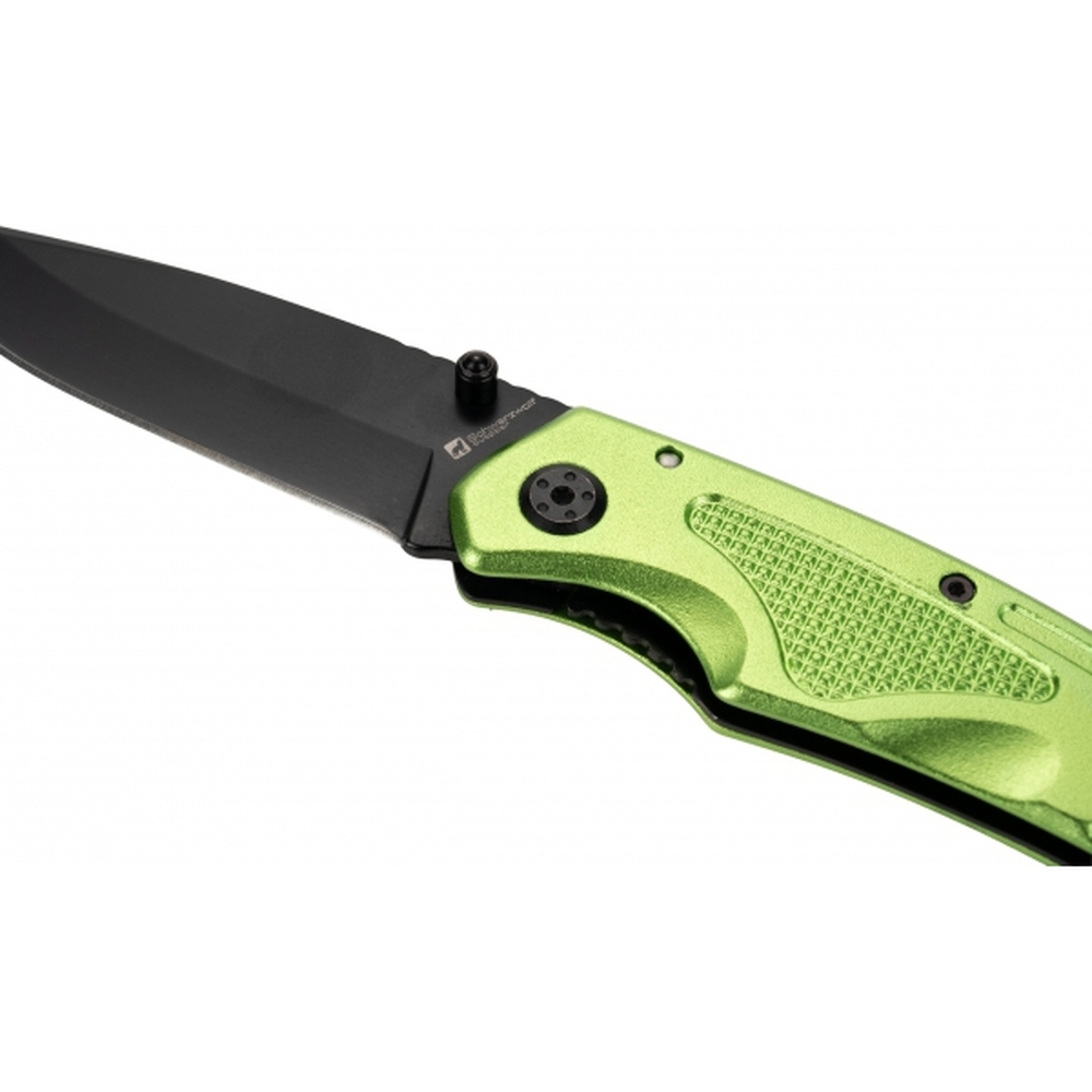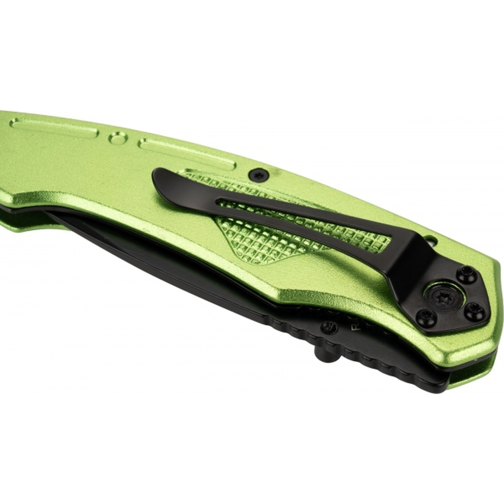 Nóż kieszonkowy wykonany ze stali nierdzewnej z aluminiową rękojeścią i klipsem do mocowania na pasku.