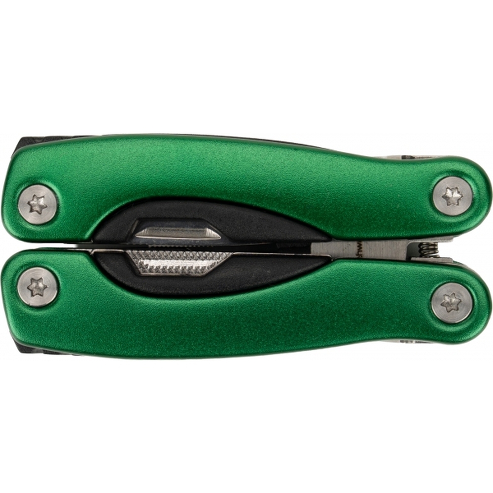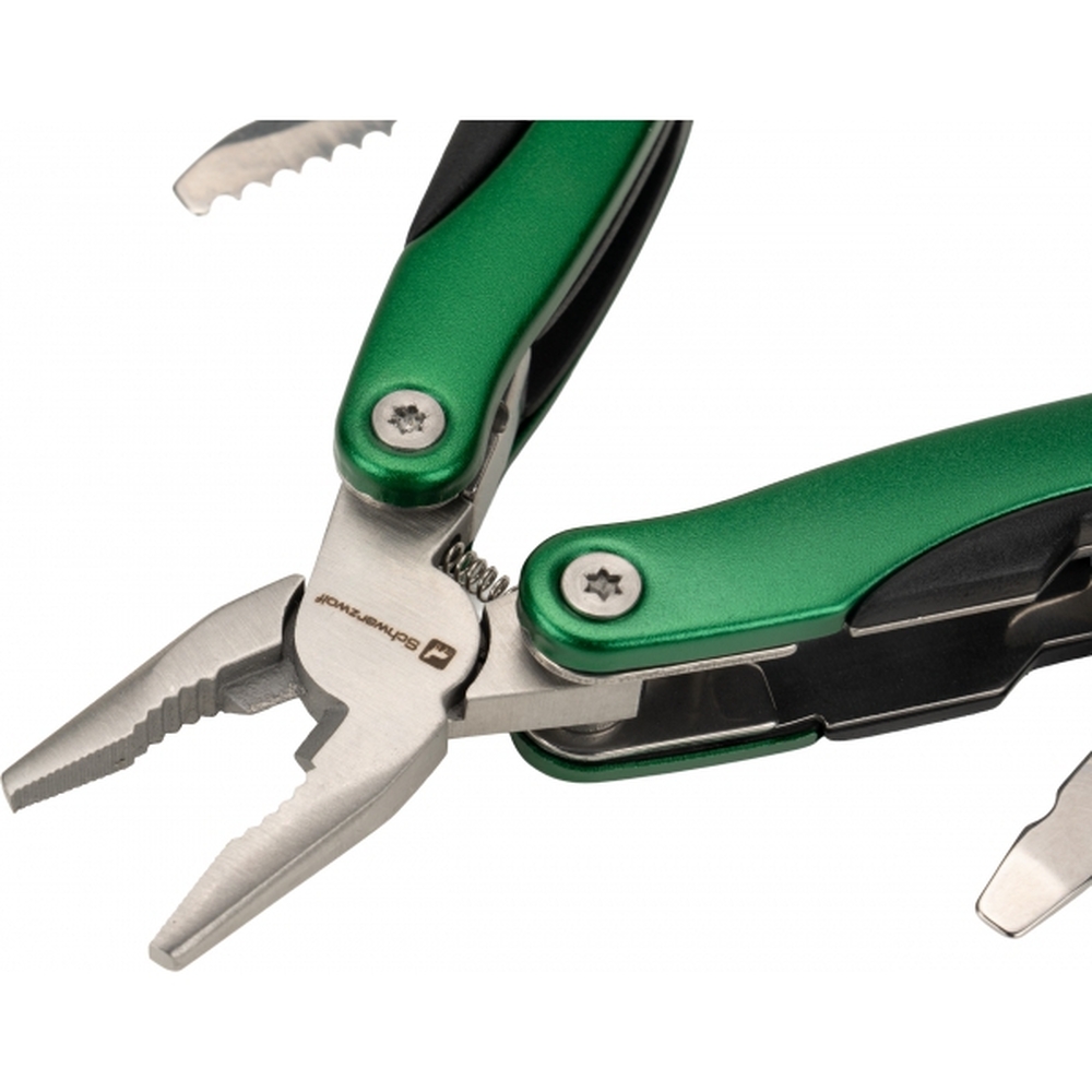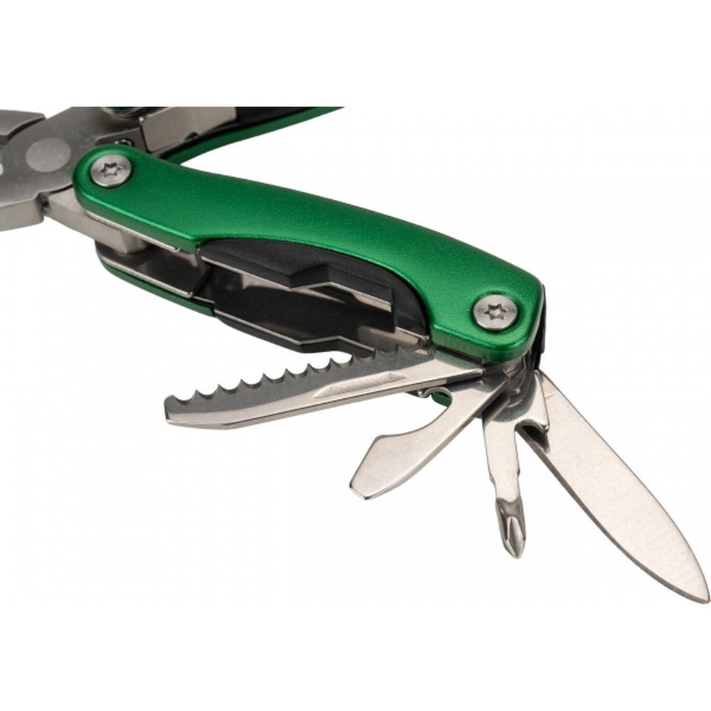 Multitool posiada 13 narzędzi, m.in.: kombinerki, pilnik, śrubokręt płaski i Philips, nóż, piłka, otwieracz do butelek i konserw. Narzędzie zapakowane w neoprenowy pokrowiec.